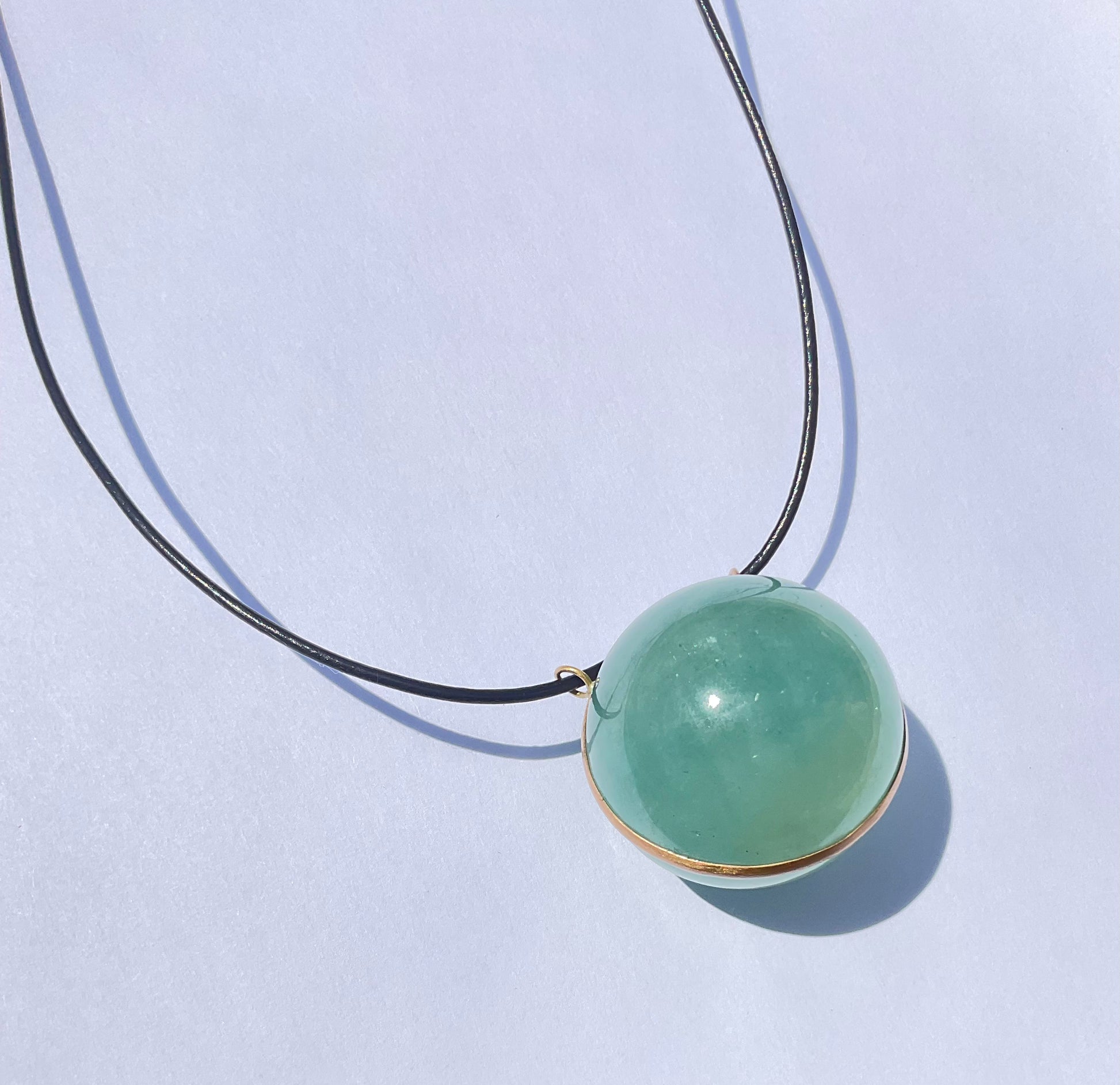 Aquamarine Healing Sphere set in 18k gold on black leather cord.