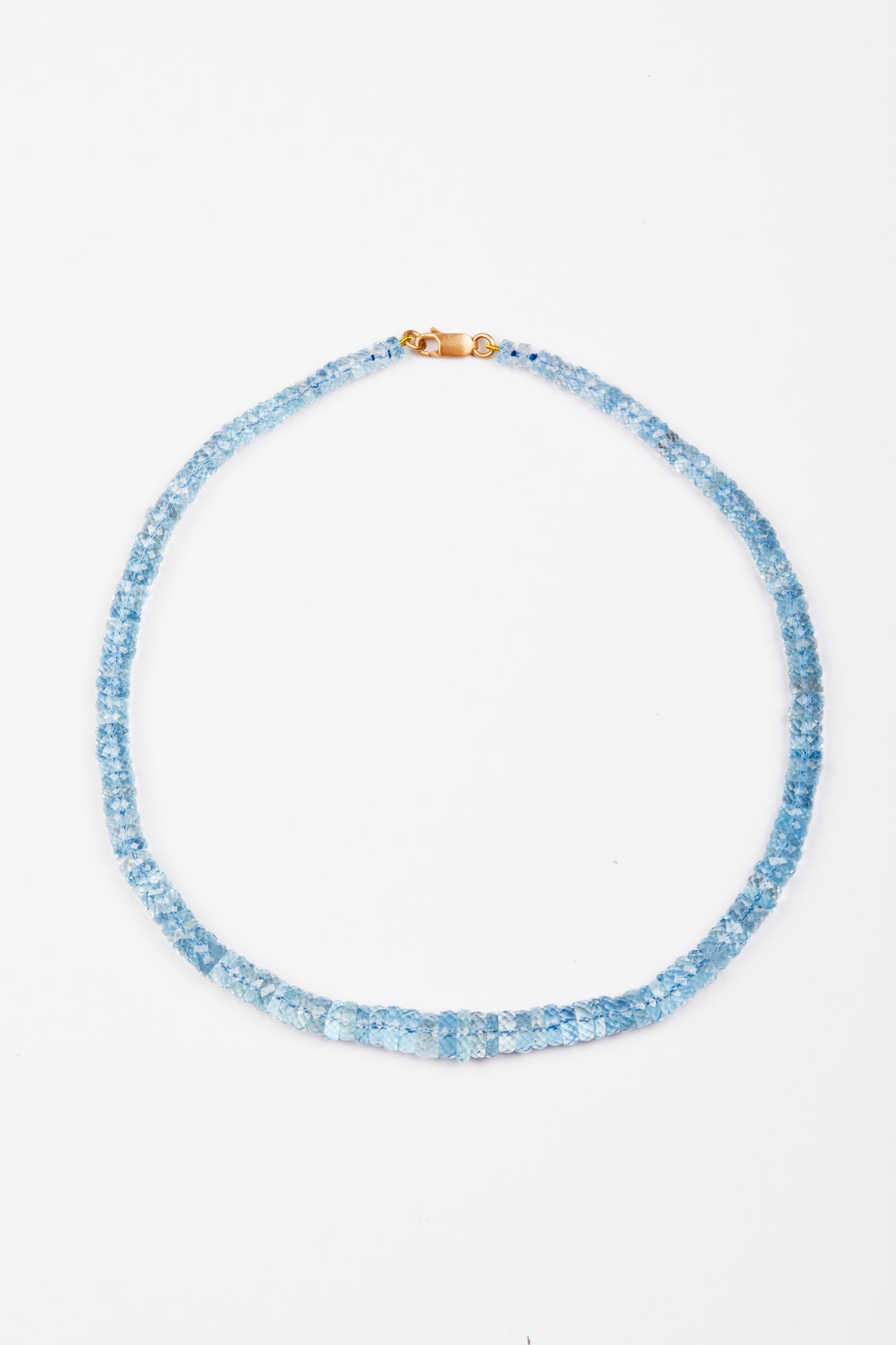 Genuine Aquamarine bead necklace measuring 16" long with a fine 18k yellow gold clasp.