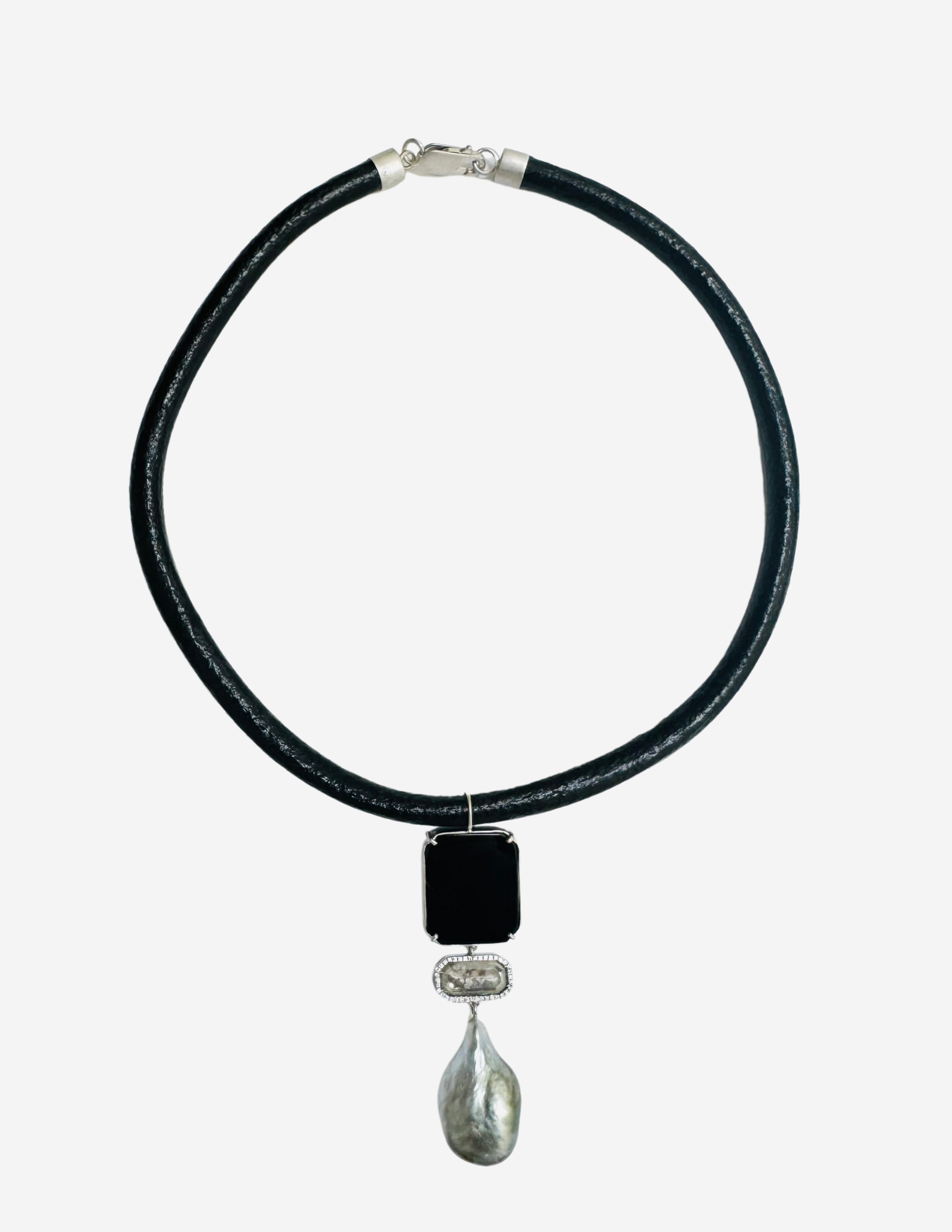 Black Leather Cord with Onyx, Diamonds and Tahitian Keshi Pearl