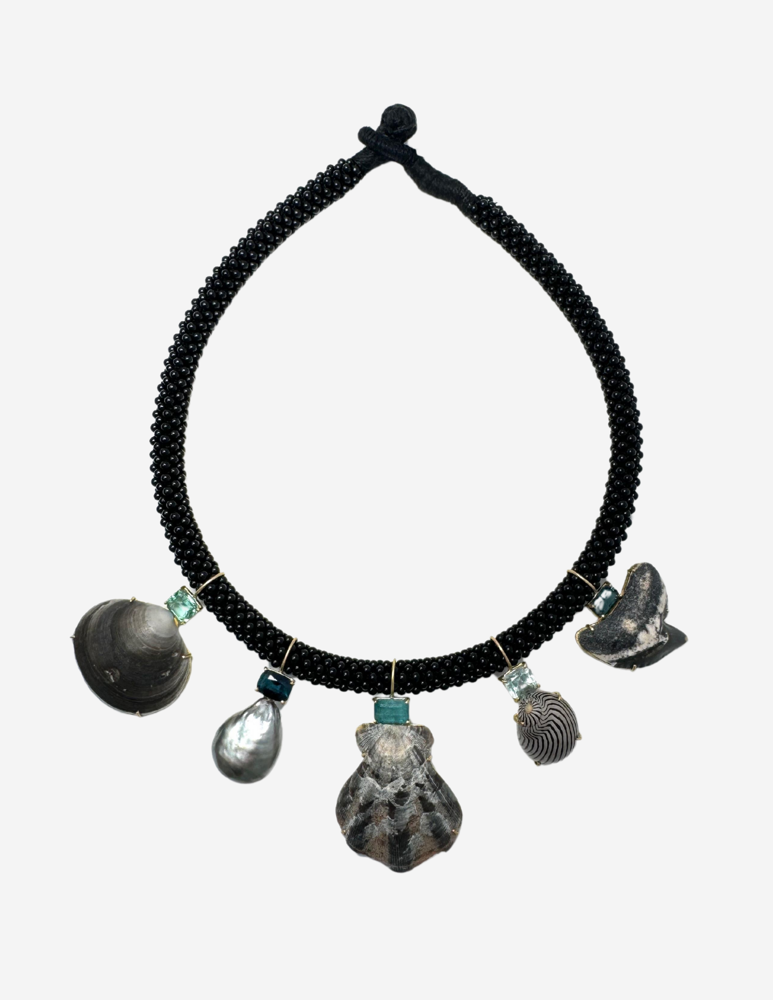 Embroidered Choker with Shells, Tahitian Baroque Pearl, Tiger Shark Tooth, Tourmalines and Aquamarine