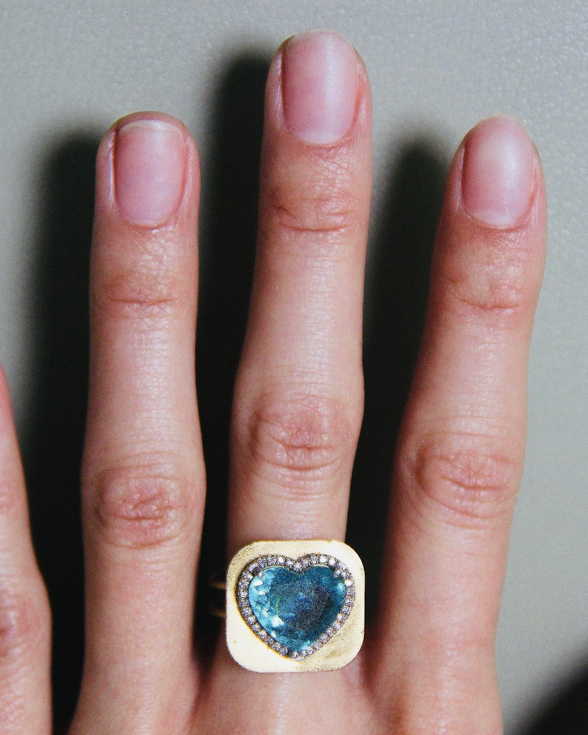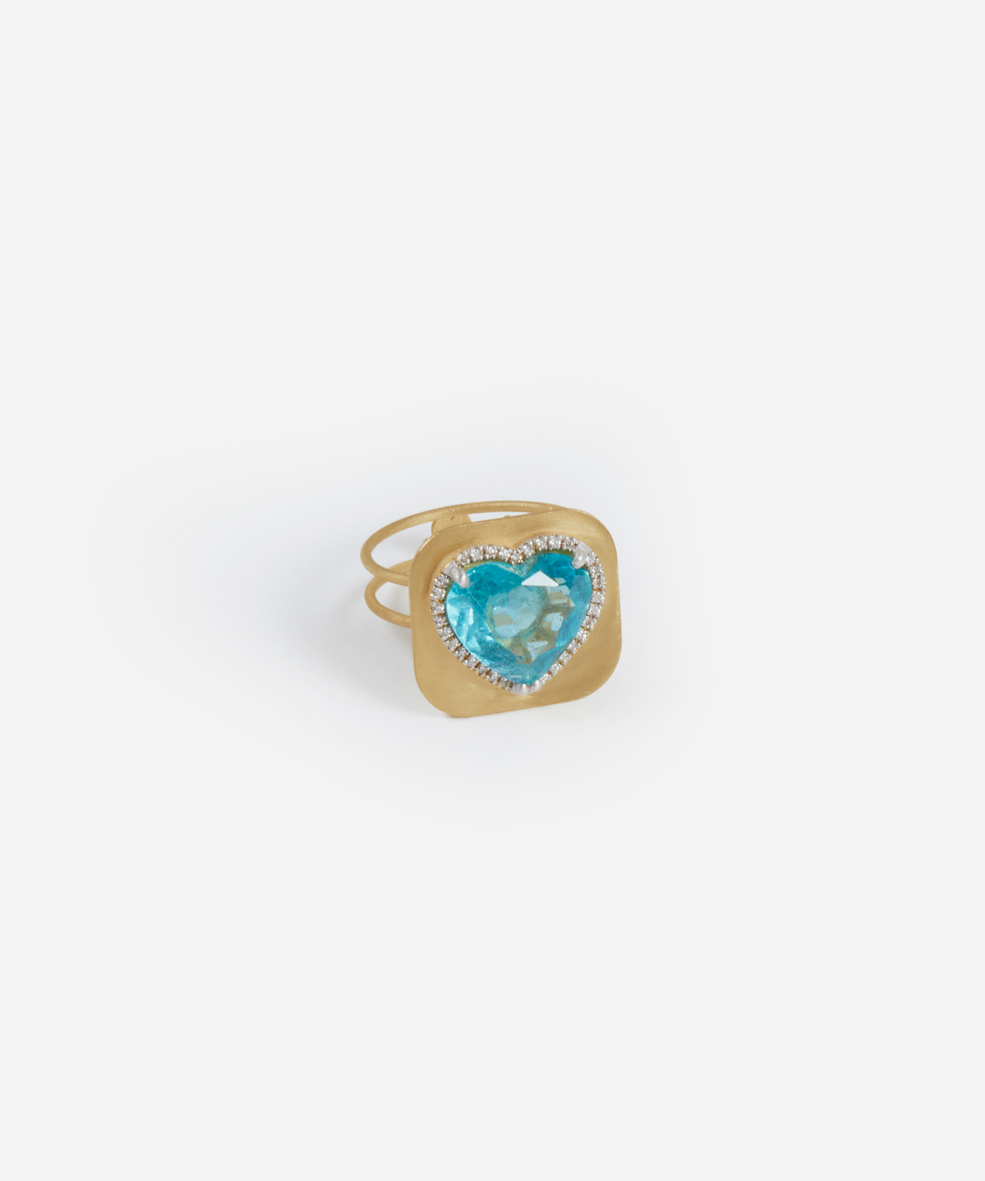 Heart shaped Blue Tourmaline with Diamond surround set in 18k matte yellow gold. Front setting including the gold measures 11x 17mm across, and ring is a size 7.