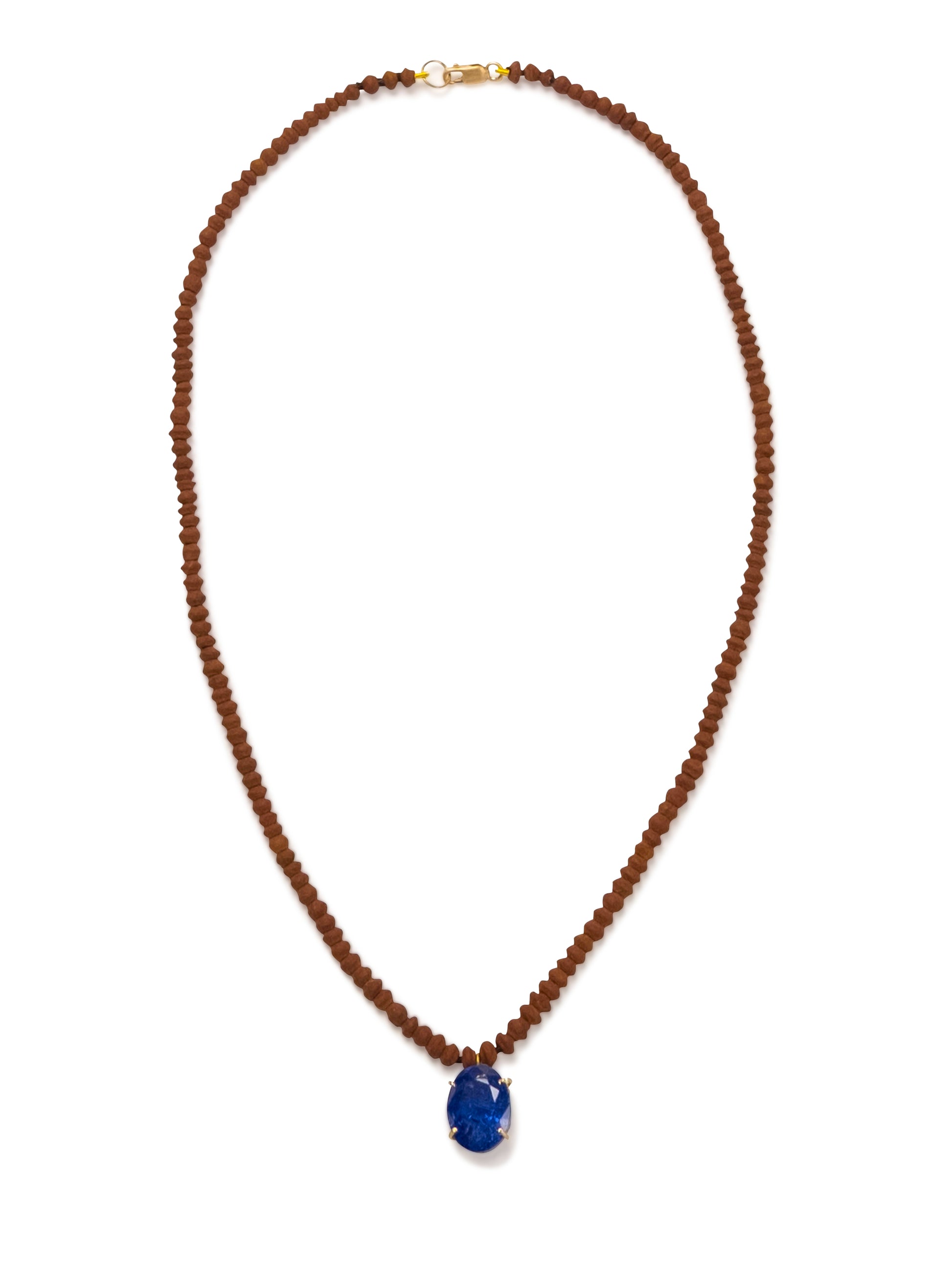 Oval shaped Tanzanite set in 18k yellow gold on Brown Jade beads measuring 16" long.
