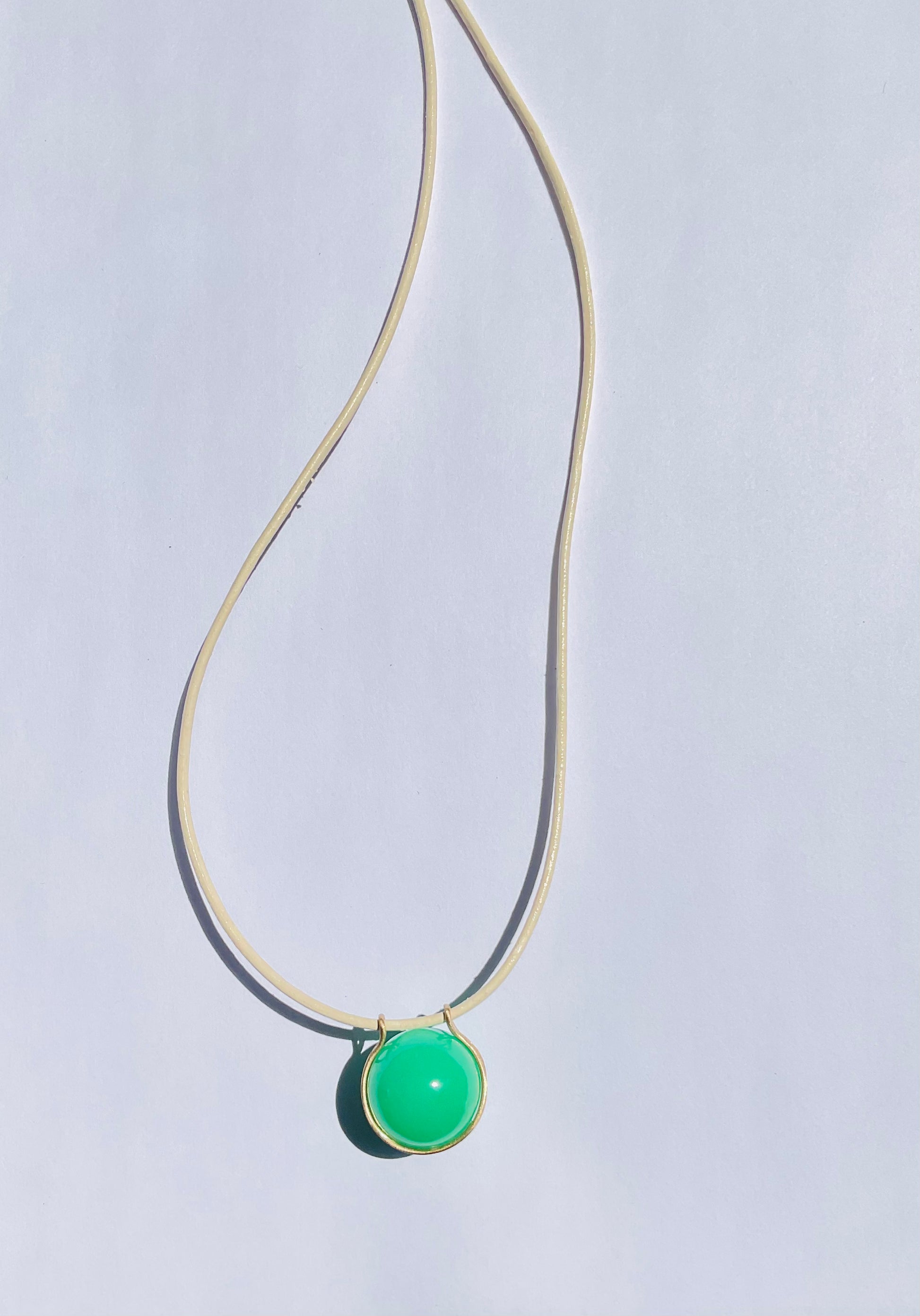 Chrysoprase Sphere measures 20mm and is set in 18k gold.