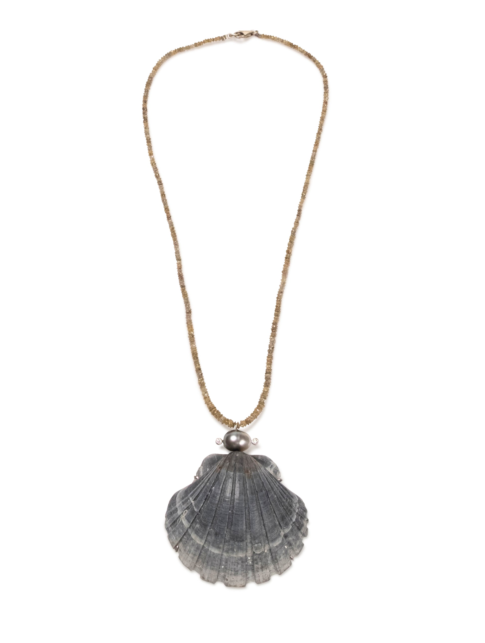 Rare grey Shell topped with a Tahitian Keshi Pearl flanked by two Diamonds, all set in 18k white gold. Pendant hangs on Diamond Heshi beads measuring 16" long.