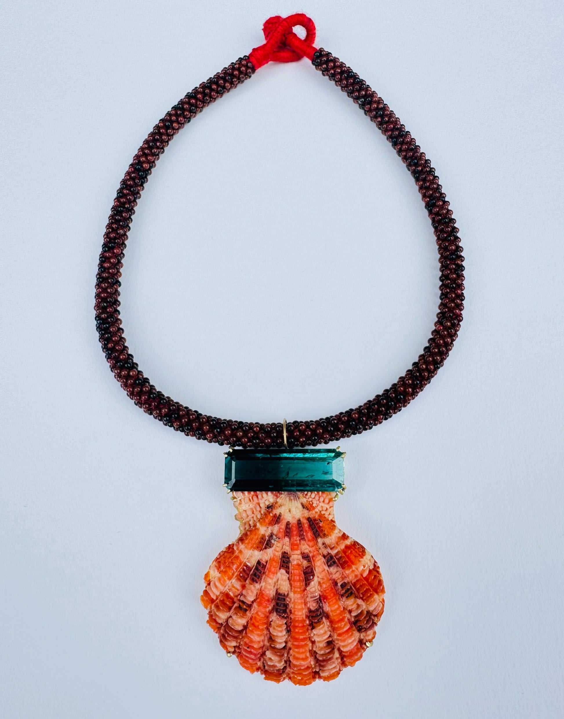 Red Tiger's Eye Embroidered Cord with Bi Color Tourmaline and Rare Shell set in 18k Gold.