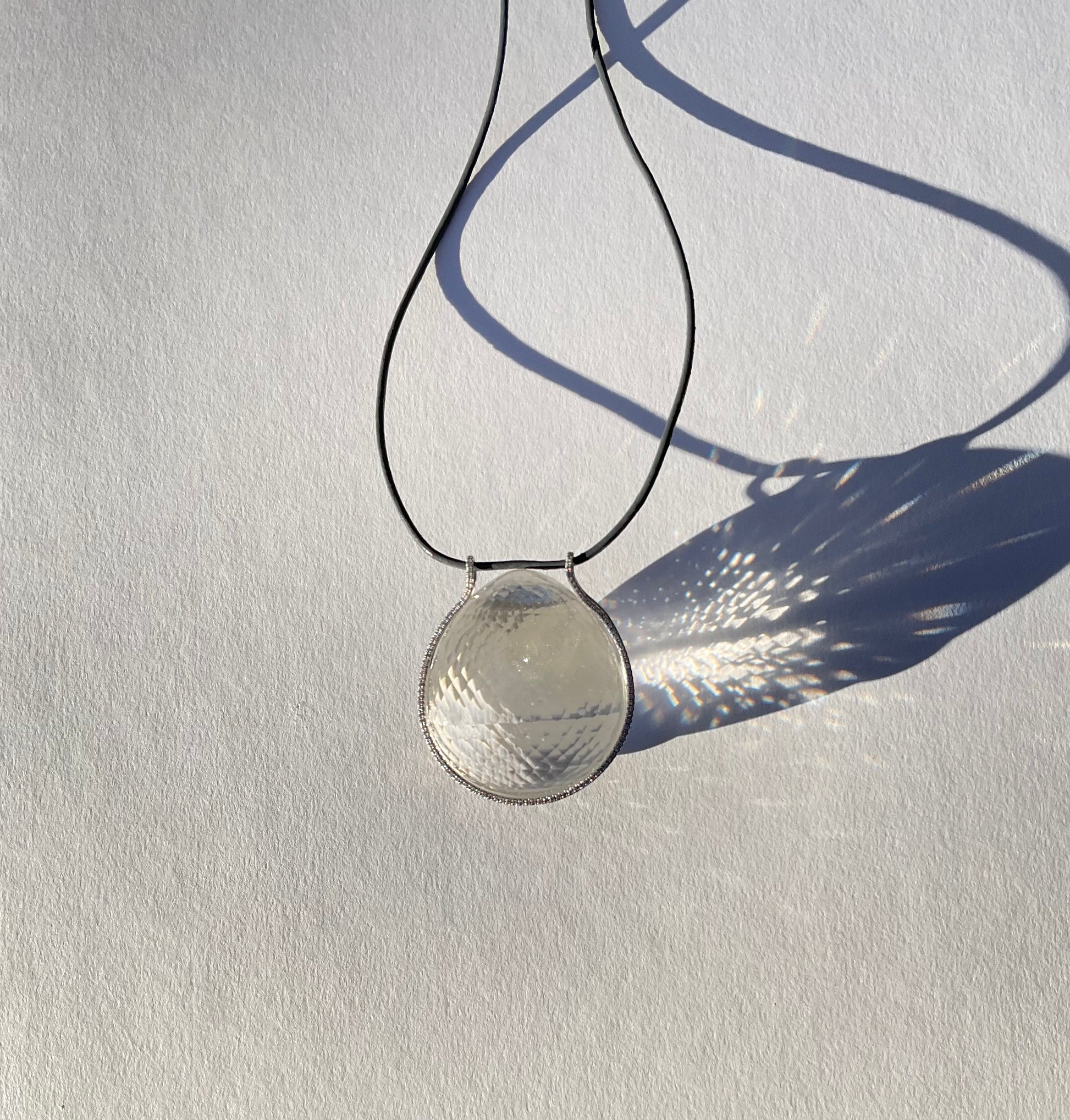 Faceted Quartz Healing Egg with Diamonds set in 18k white gold on Grey Leather Cord with 18k clasp.