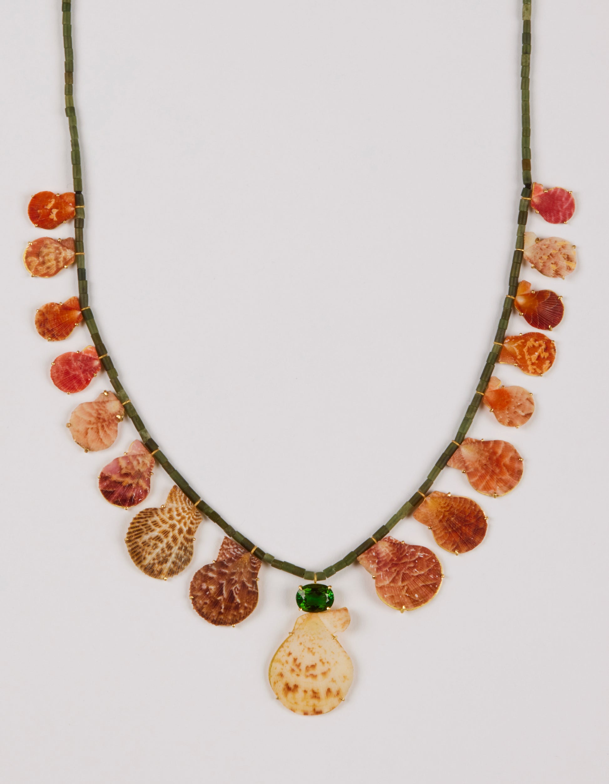 Rare Shells with Green Tourmaline set in 18k yellow gold, on Green Jade beads measuring 32" long.