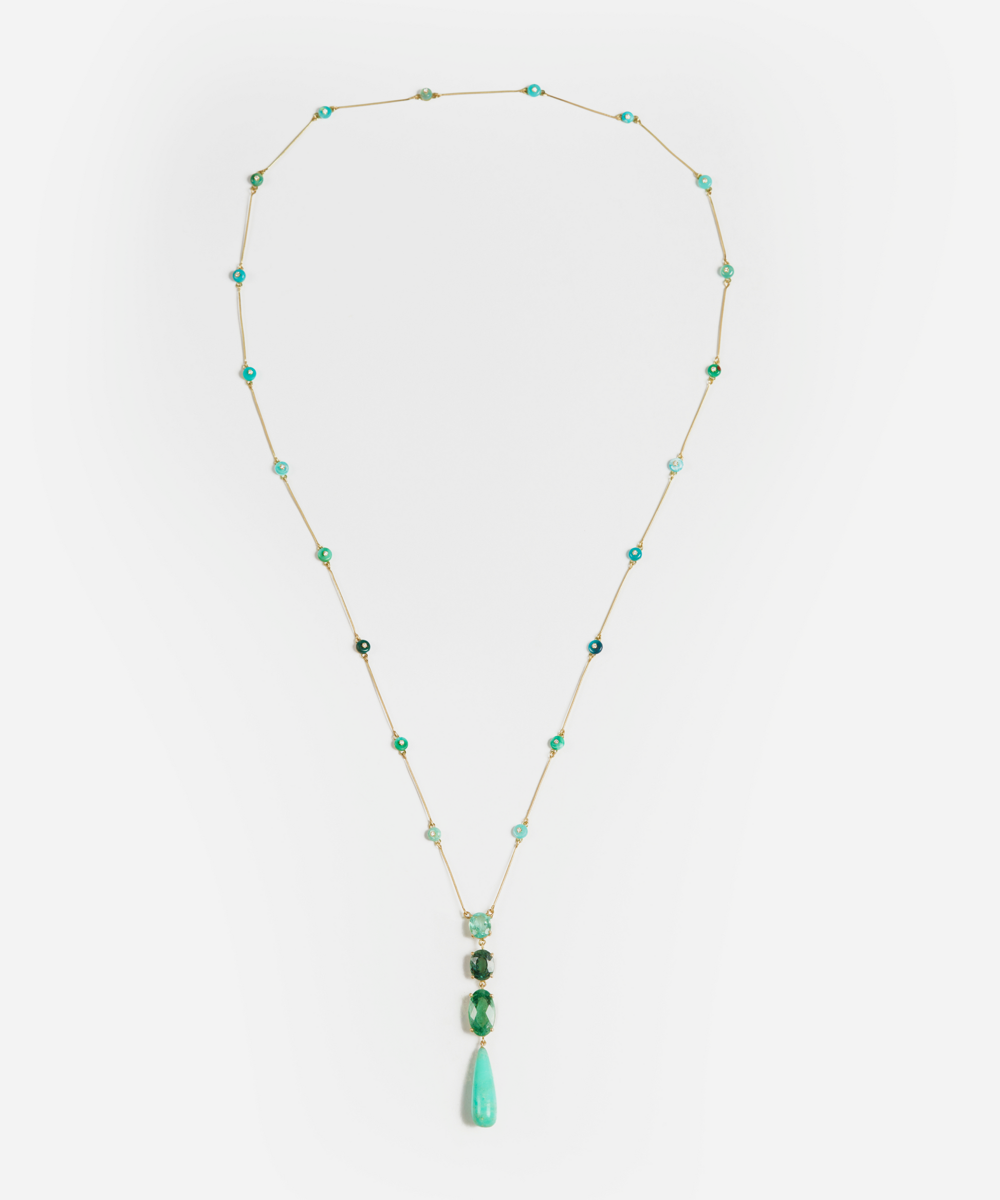 Greens drop necklace made of Chyrsoprase, Turquoise, Chrysocolla, Variscite, Tourmaline and Diamonds set in 18k yellow gold. Necklace measures 34" long including drop.