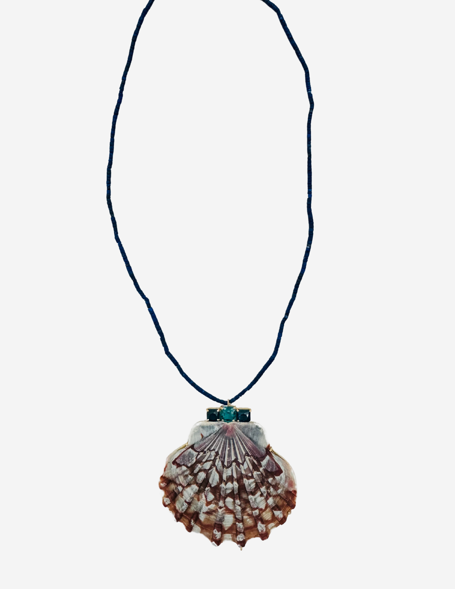 Rare Shell topped with a trio of Tourmalines set in 18k yellow gold. Pendant hangs on blue Lapis beads measuring 16" long.