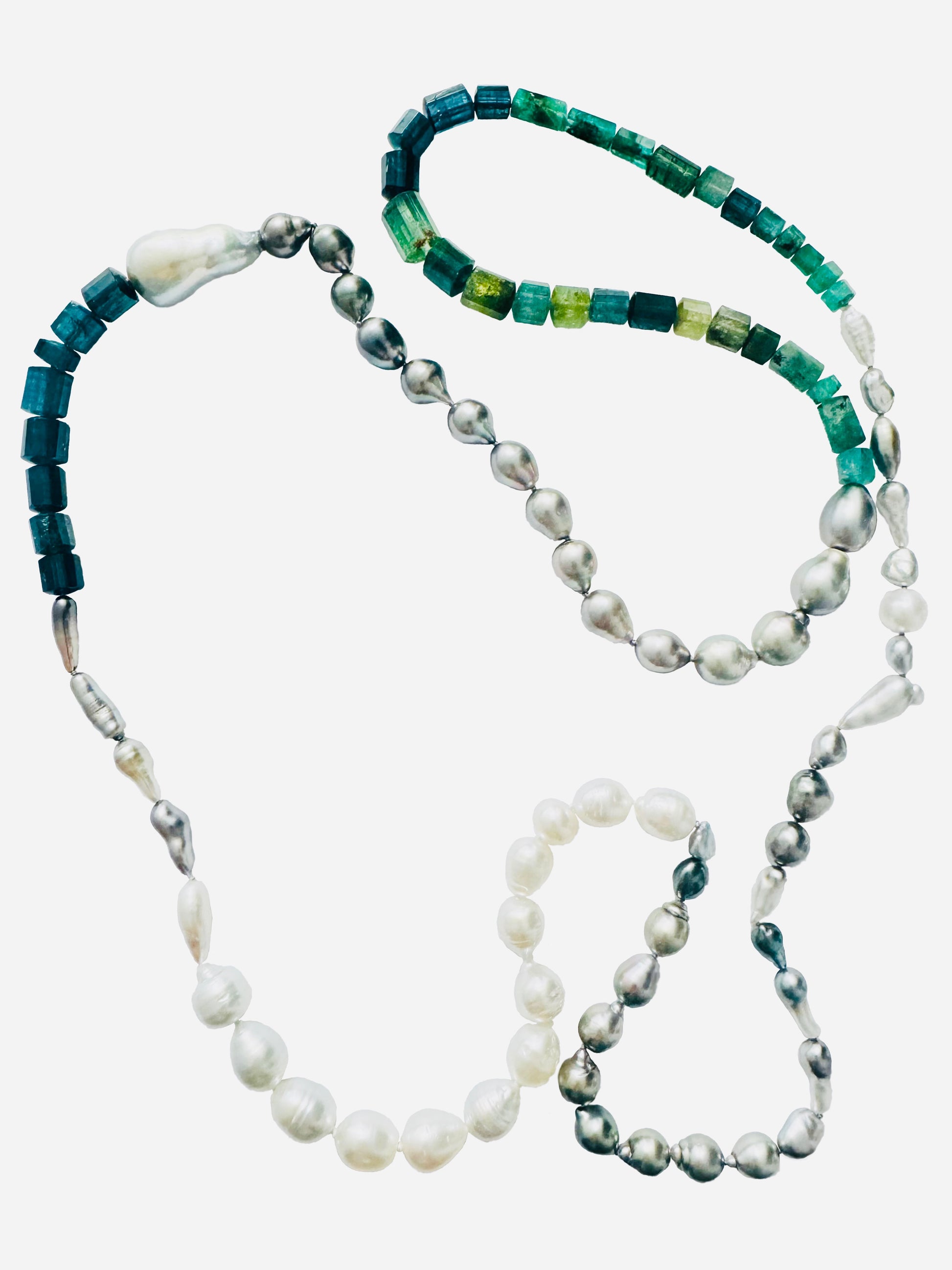 Long Tahitian Keshi Pearls with Green Tourmalines, Emeralds and Indicolite