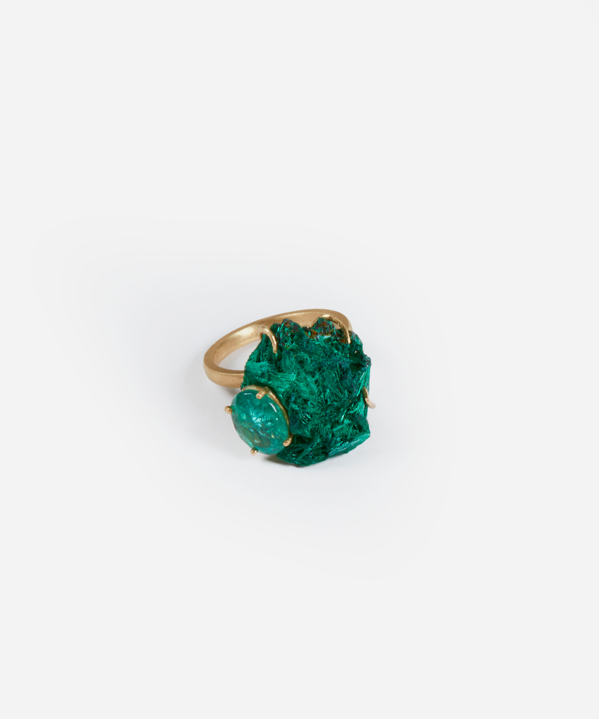 Large green Malachite nugget with Green Tourmaline set in the side with 18k yellow hold. Ring is a size 7 and is made of 18k yellow gold, with the front setting measuring 19mm across.
