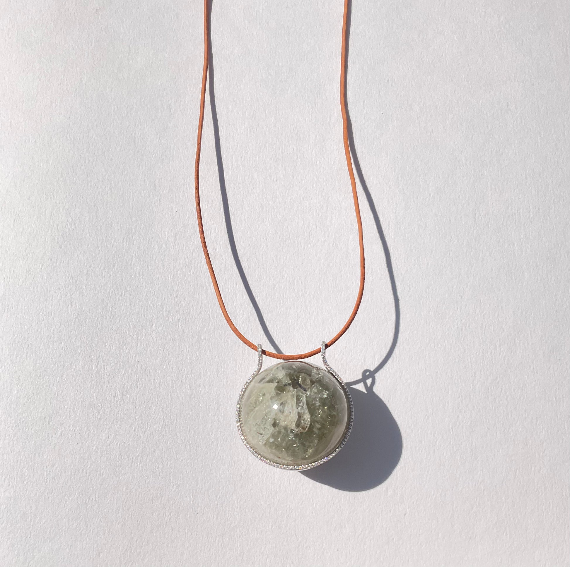 Moonstone Healing Sphere with Diamonds set in 18k white gold on leather with 18k white gold clasp.