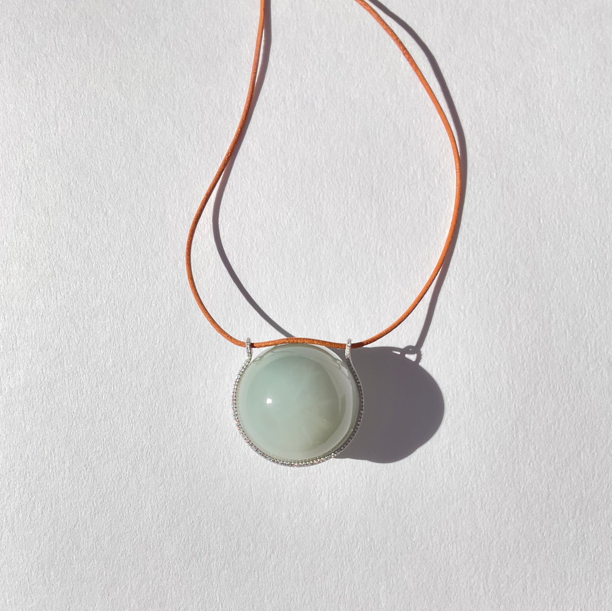 Moonstone Healing Sphere set in 18k white gold with diamonds on brown leather with 18k white gold clasp.