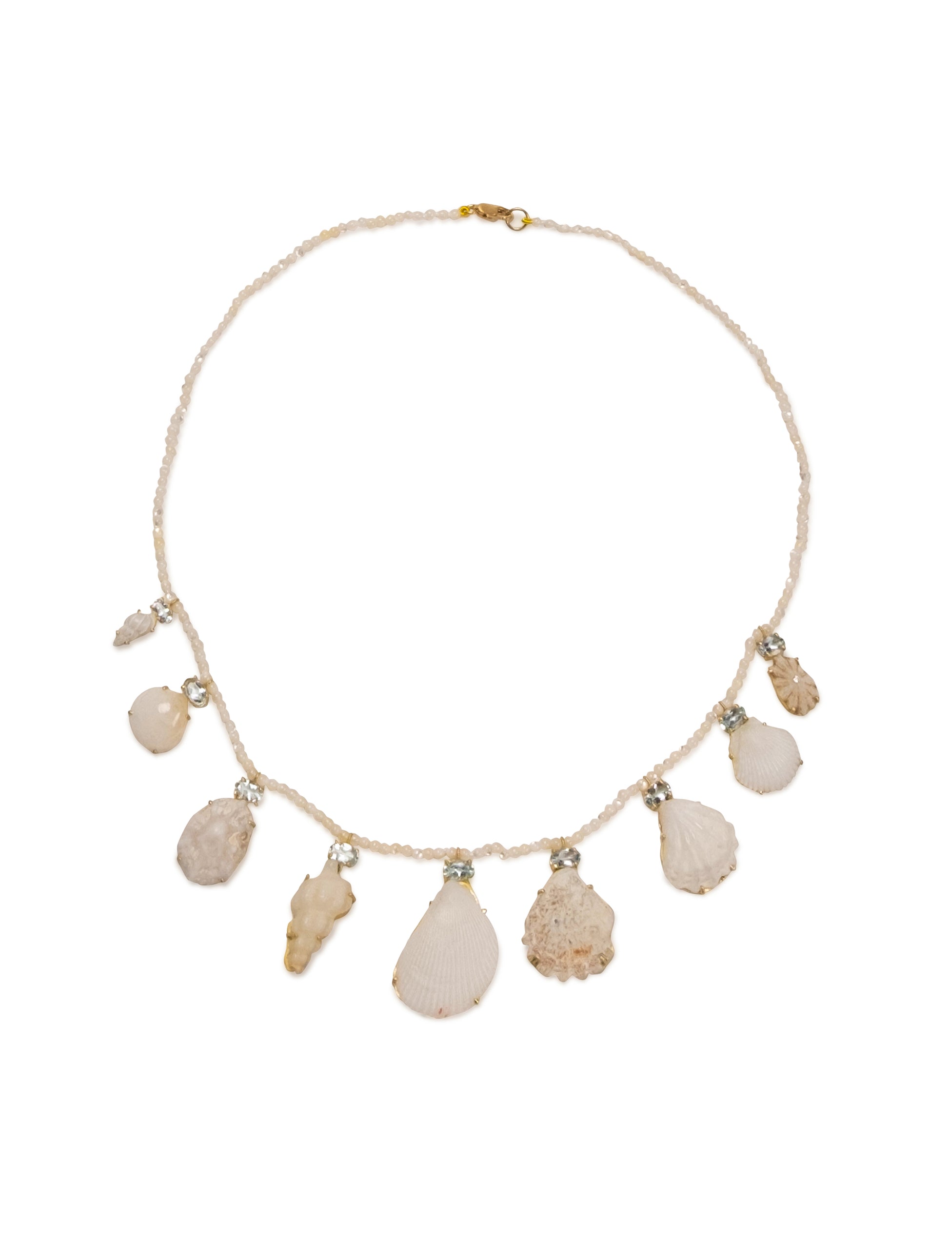 Multi white Shells with Aquamarines, set in 18k gold on Mother of Pearl beads measuring 16" long.
