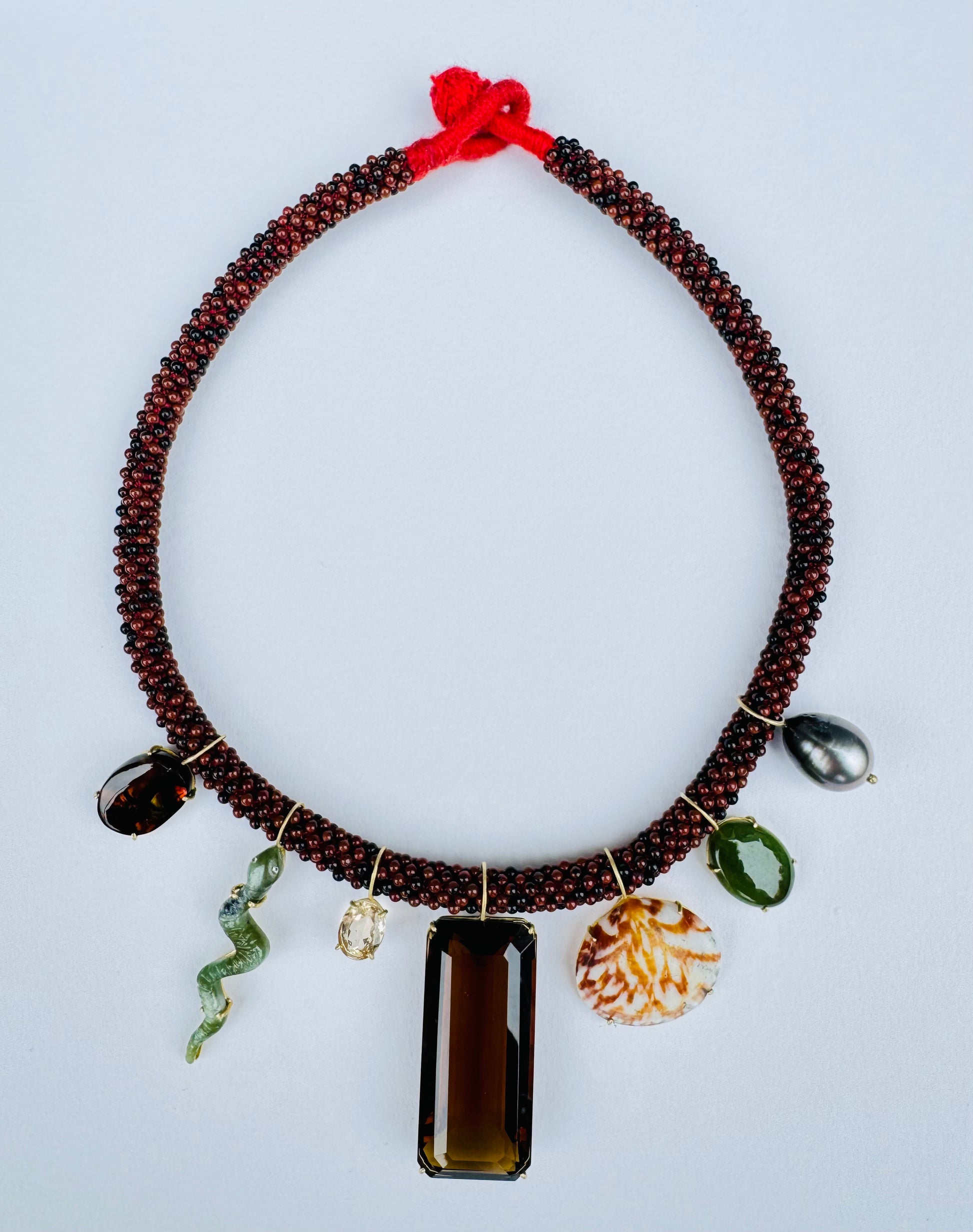 Red Tiger's Eye Embroidered Cord with Smokey Topaz, Beryl, Jade, Tahitian Keshi Pearl and Fire Agate set in 18k Gold