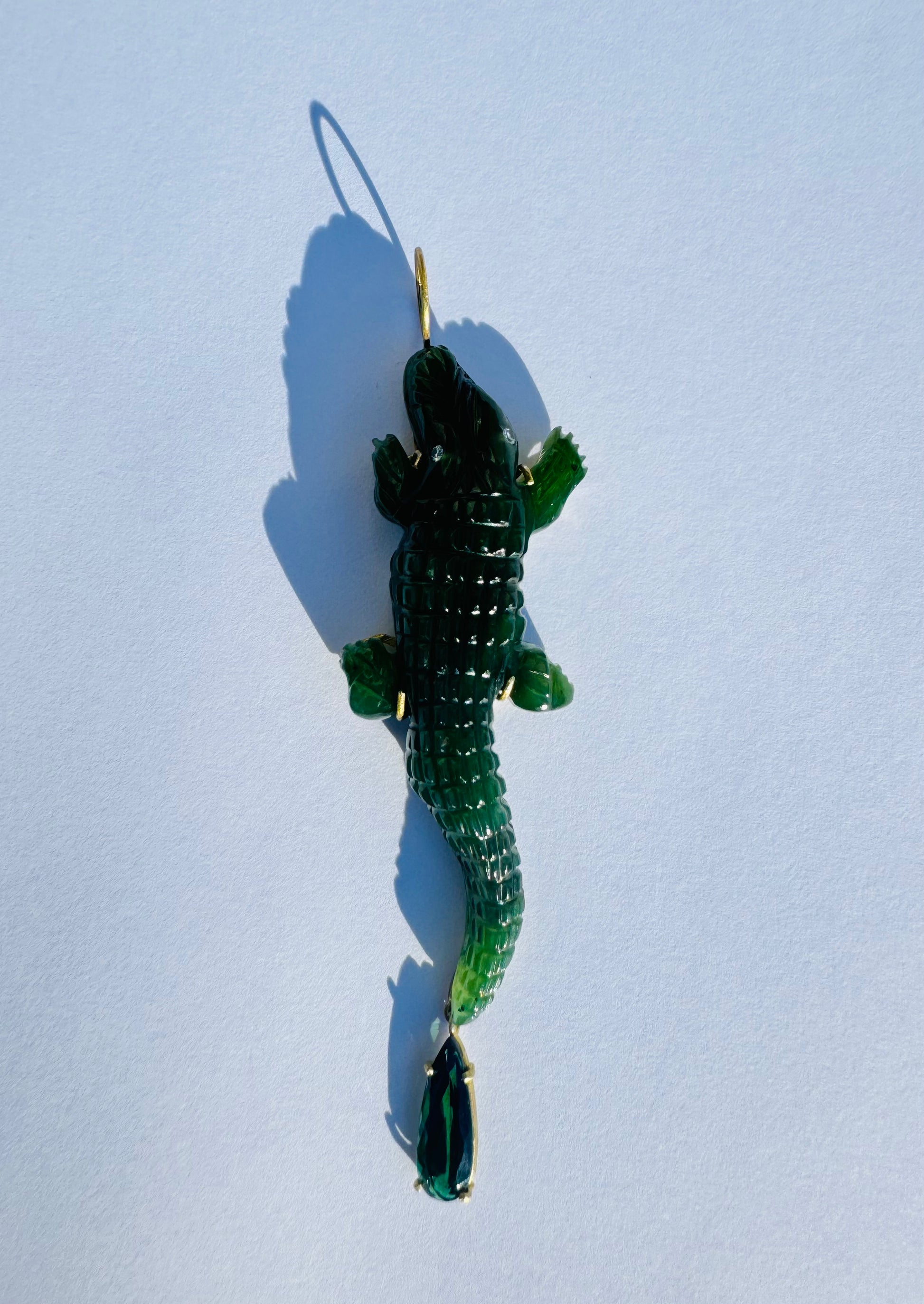 Nephrite Alligator Carved Pendant with Green Tourmaline and Diamond Eyes Set in 18k Gold.
