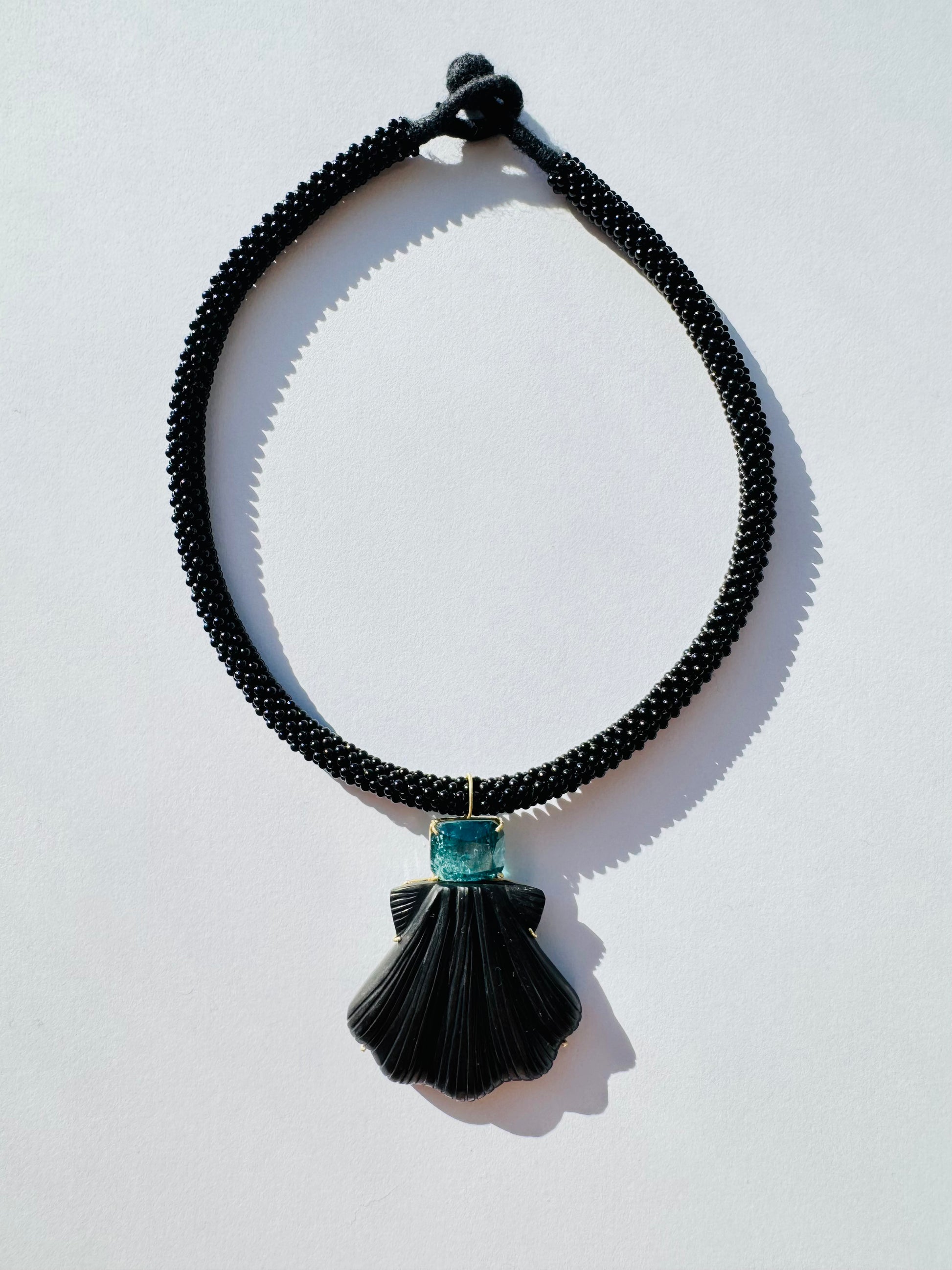 Onyx Shell Carving with Blue Tourmaline set in 18k on Black Onyx Choker.