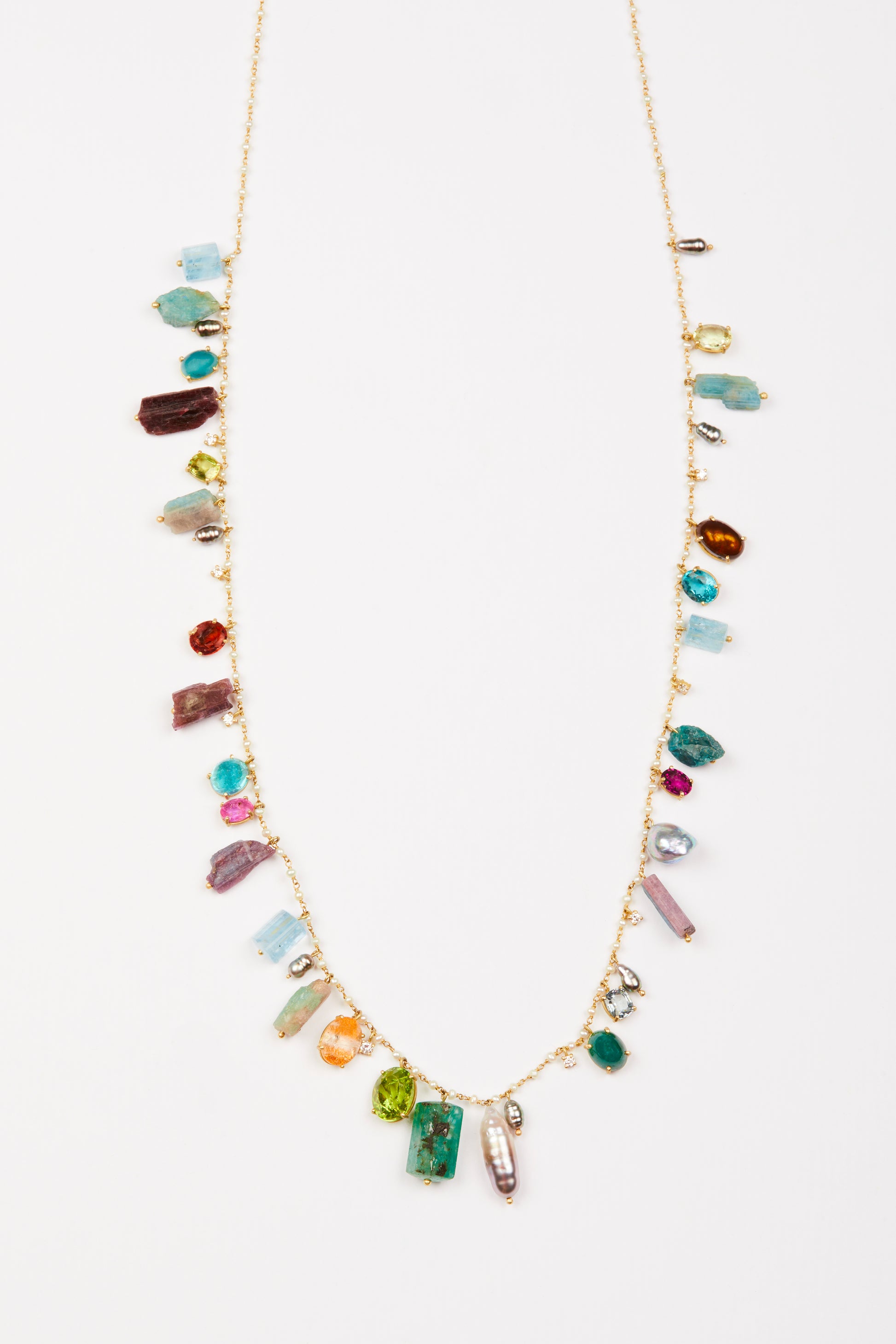 Colorful multi Gems and Tahitian Keshi Pearls set in 18k yellow gold on a Pearl chain measuring 36" long.