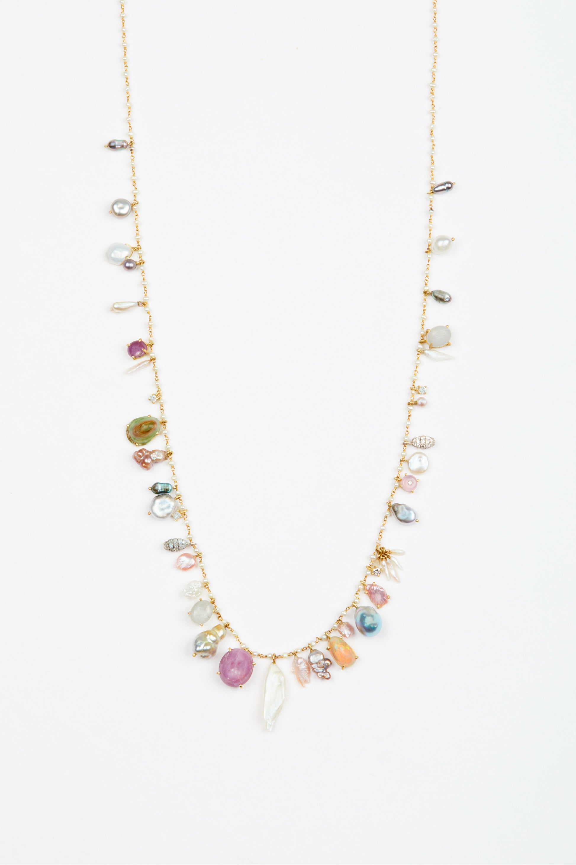 Multicolor Pearls, Diamonds and Shells set in 18k yellow gold on Pearl chain measuring 30" long.