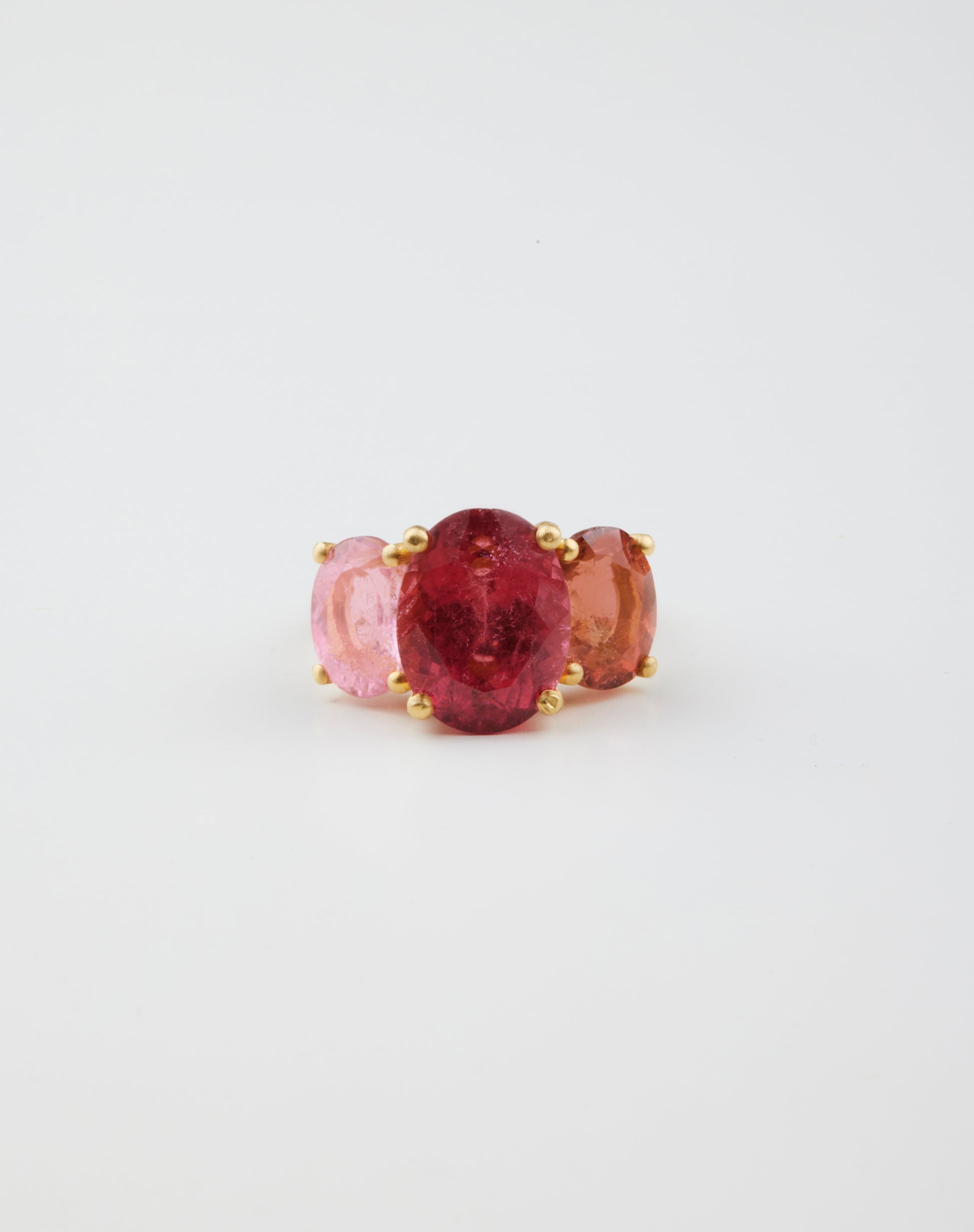Trio of Pink Tourmalines set in 18k yellow gold. Ring is a size 7.
