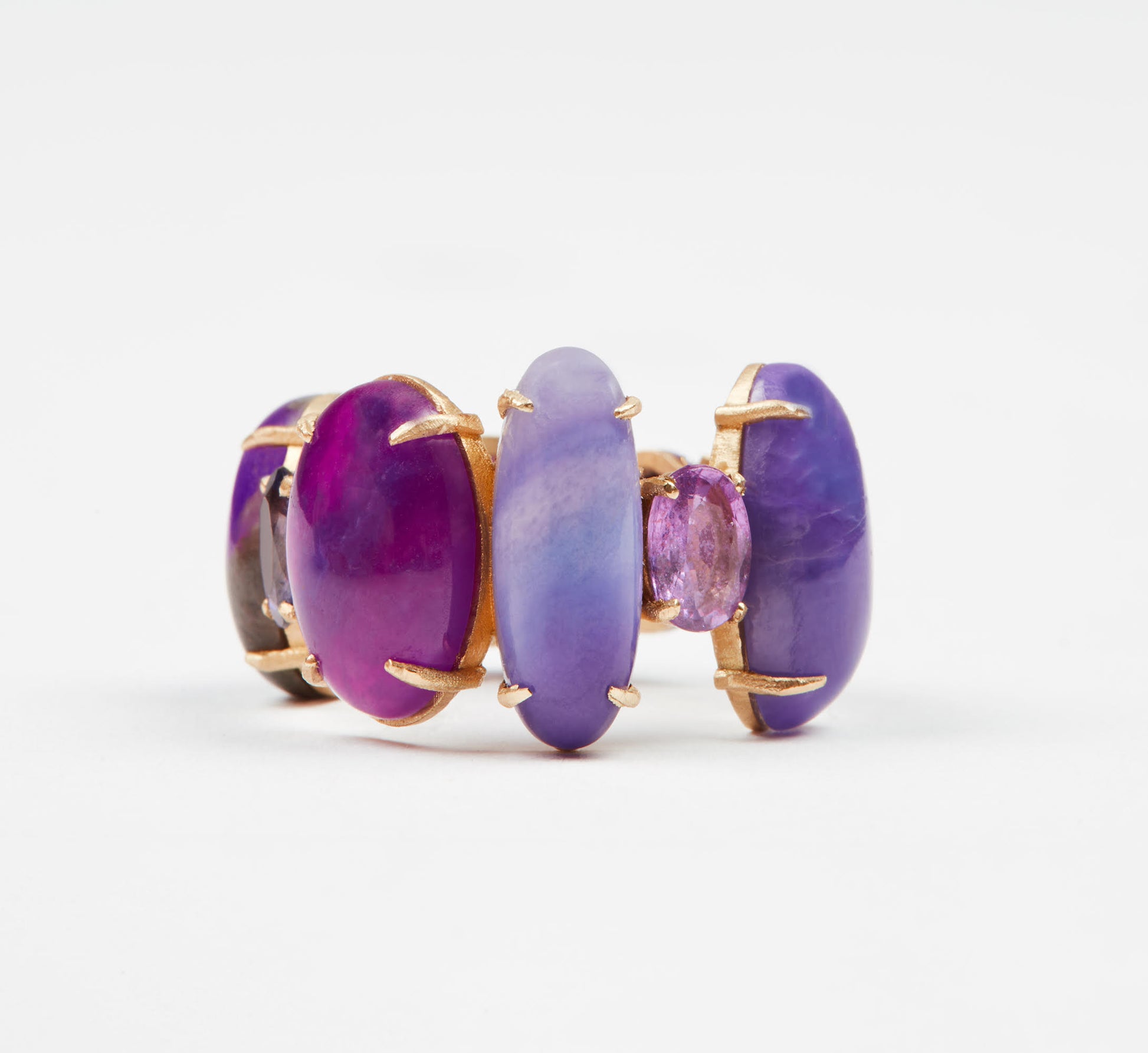 Purple ring made of Sugilite, Richterite and Sapphire set in 18k yellow gold. Ring is a size 5.5.