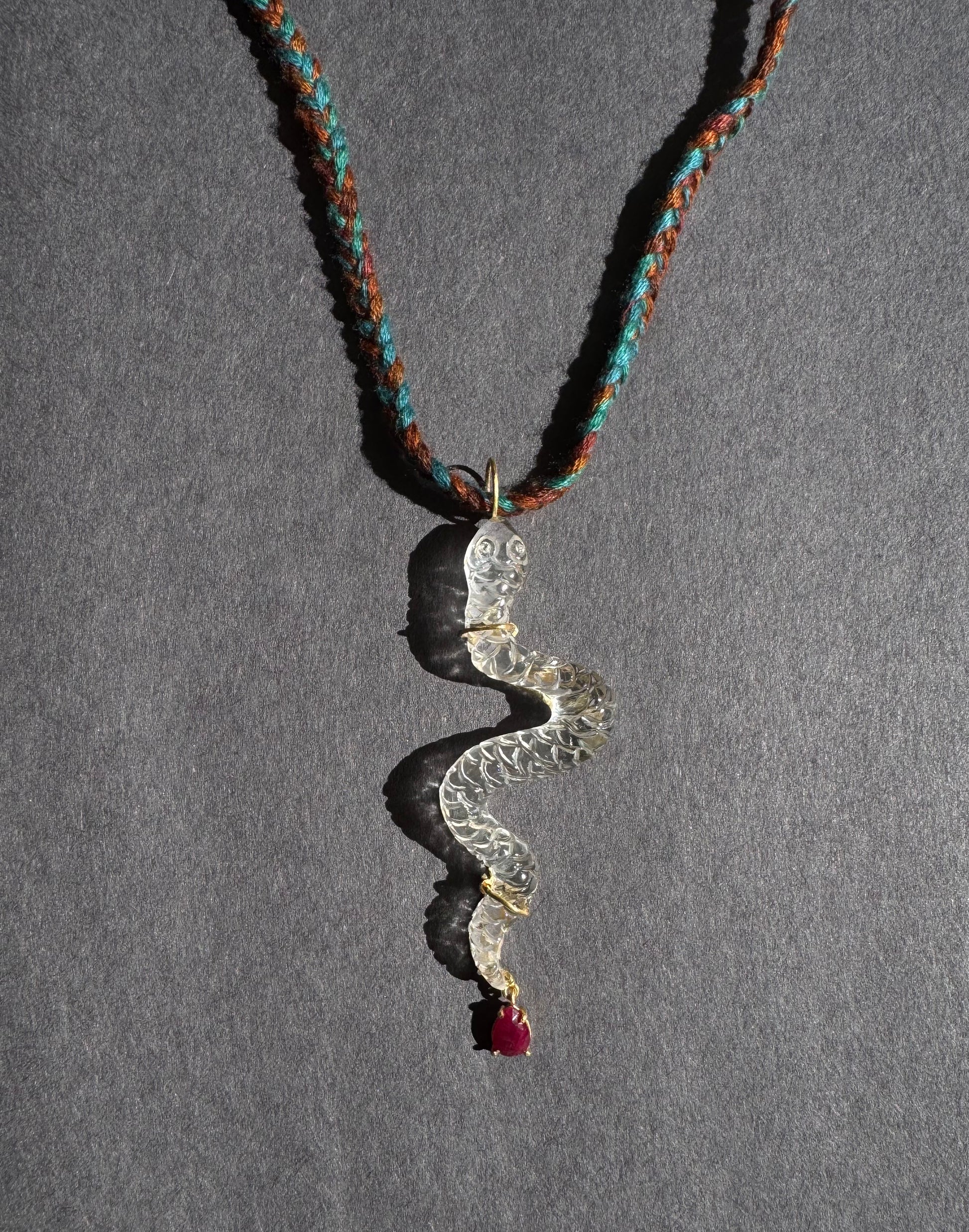 Quartz Snake Pendant with Diamond Eyes and Ruby set in 18k Gold.