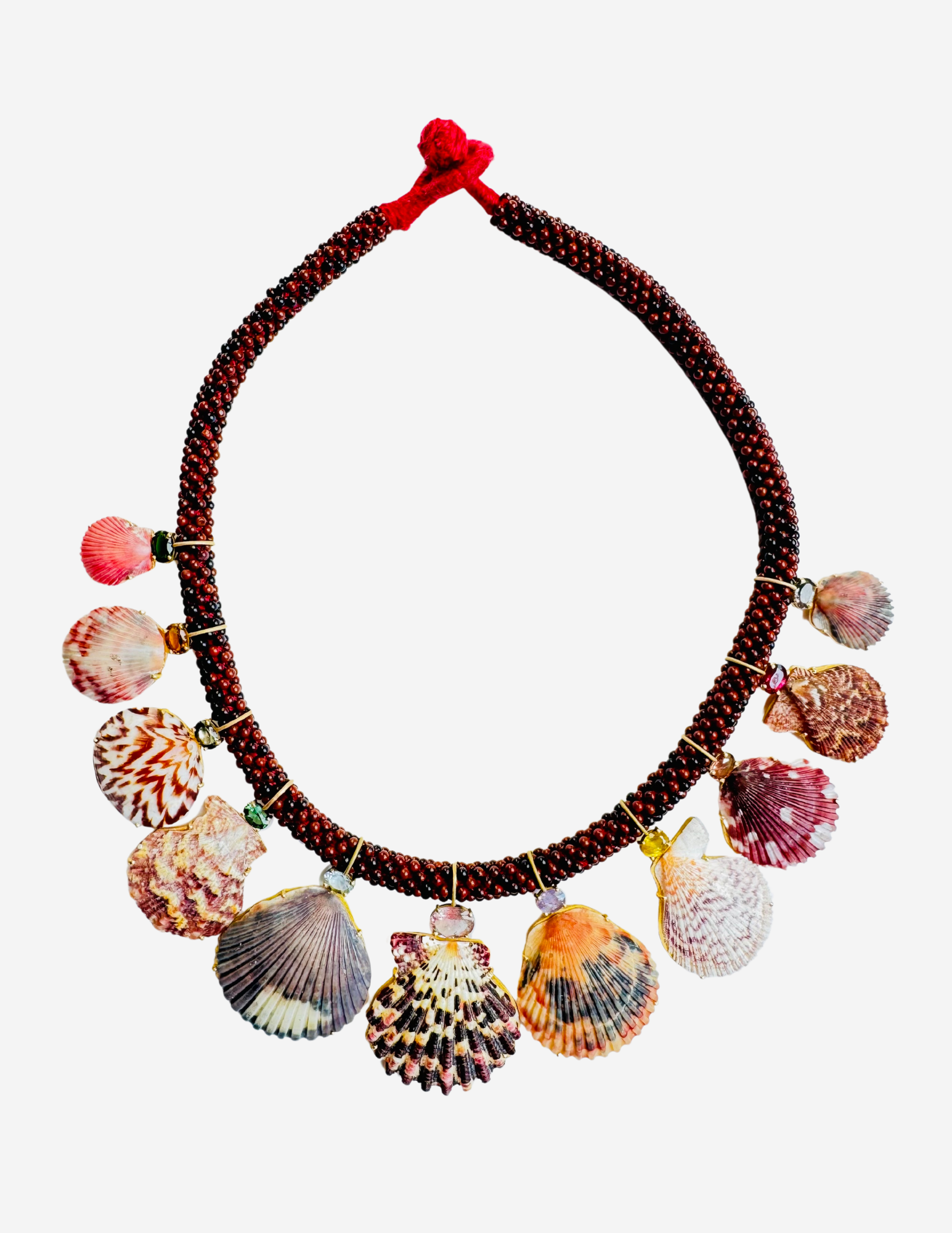15" long Red Jasper Embroidered Cord Necklace with Rare Shells and Tourmaline set in 18k Yellow Gold.