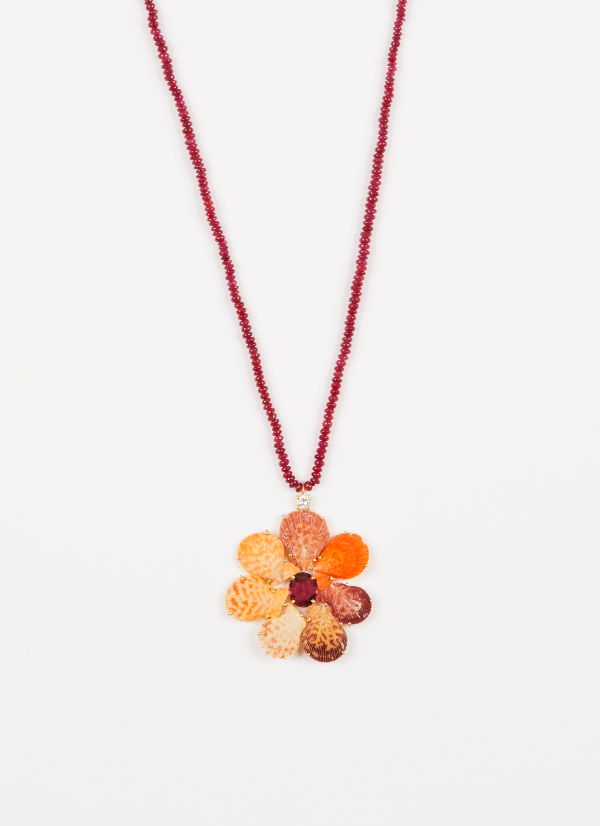 Rare Shells arranged in the shape of a flower with an oval shaped Garnet center and Diamond top. Shells, Garnet and Diamond are set in 18k yellow gold and hang on Ruby beads.