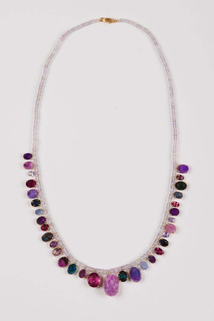 Multi Gems set in 18k yellow gold on beautiful Sapphire beads measuring 22" long. Clasp is made of 18k yellow gold.