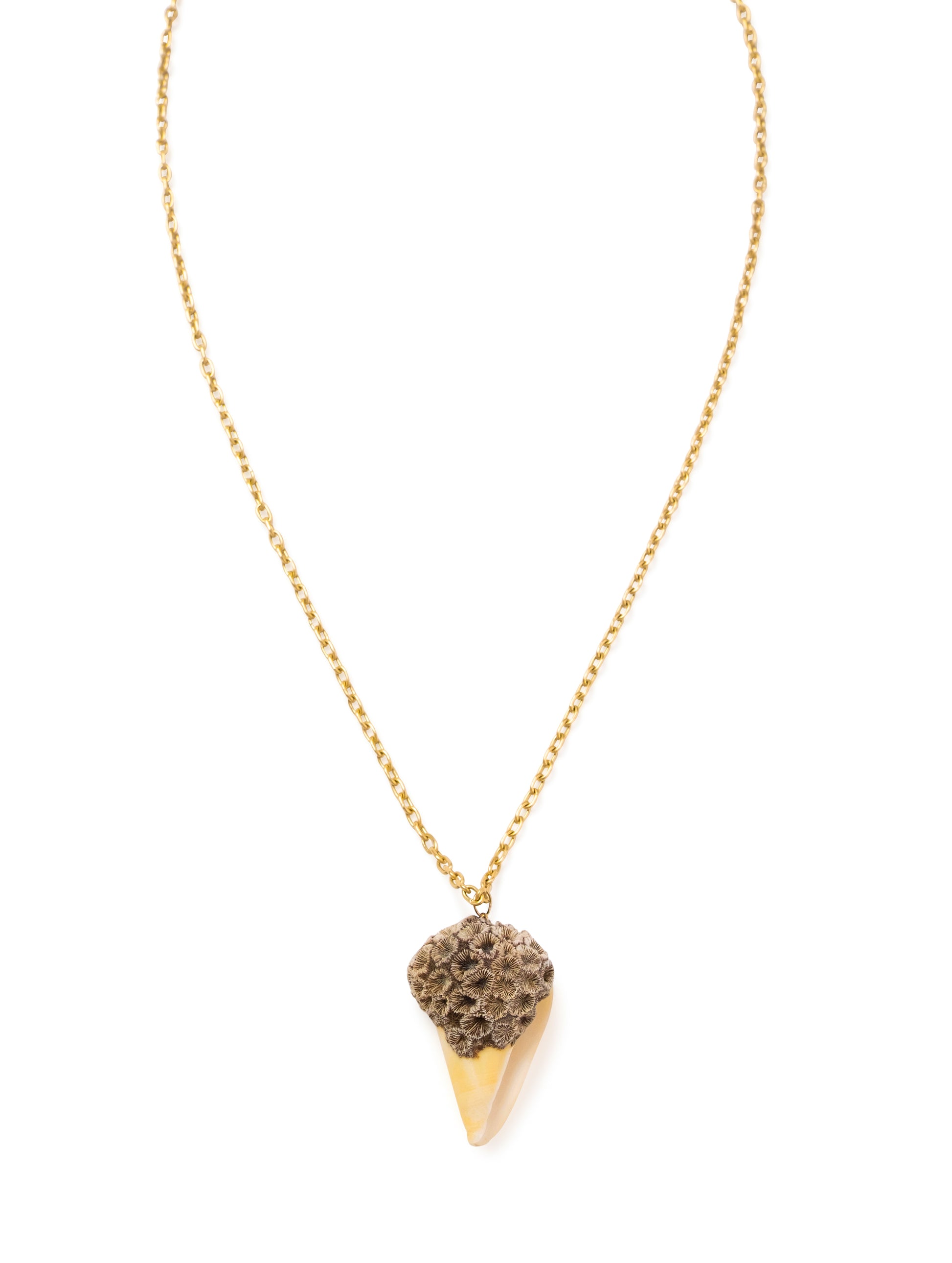 White Shell with Coral formation set in 18k yellow gold. Purchase includes pendant only.