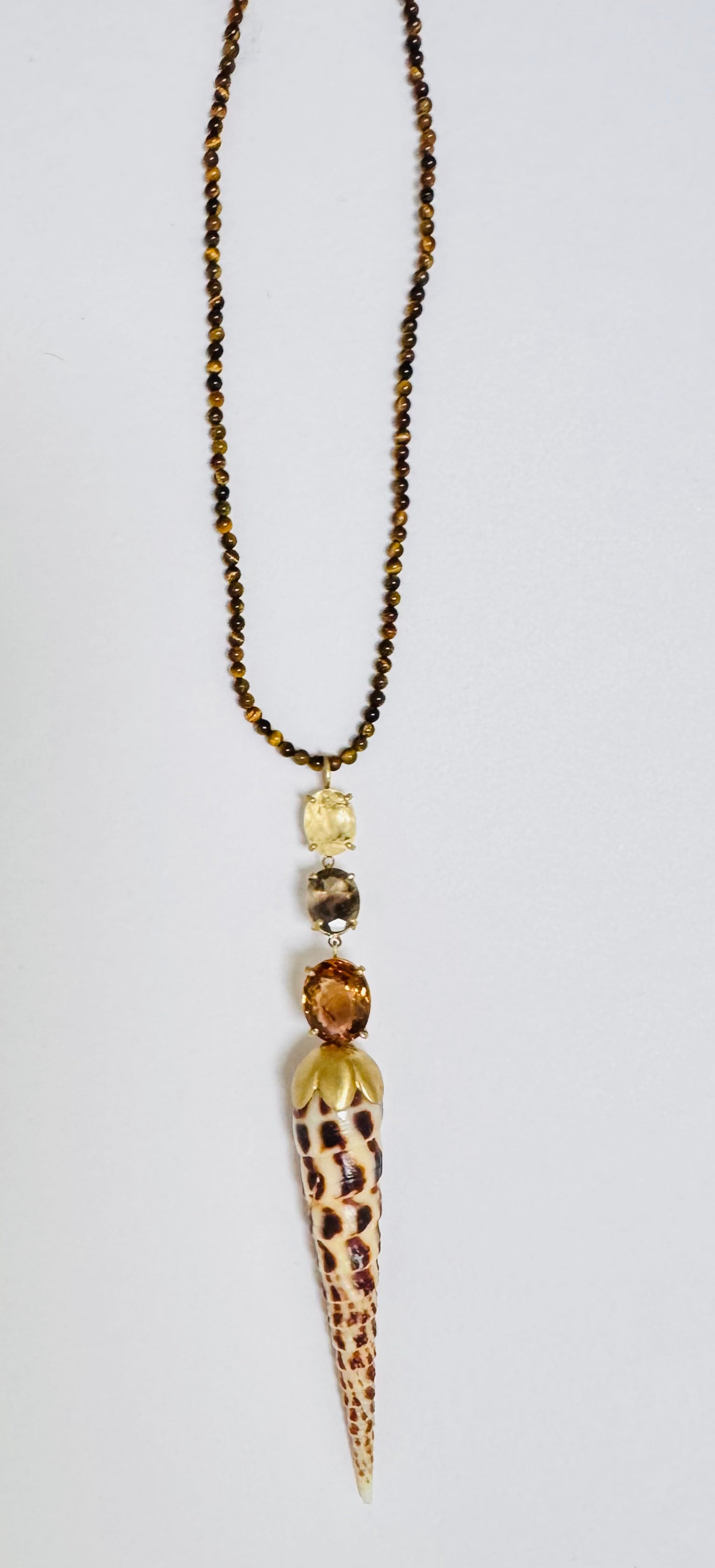 Shell with Madeira Citrine, Smokey Topaz and Beryl on TIger's Eye Beads set in 18k Gold.