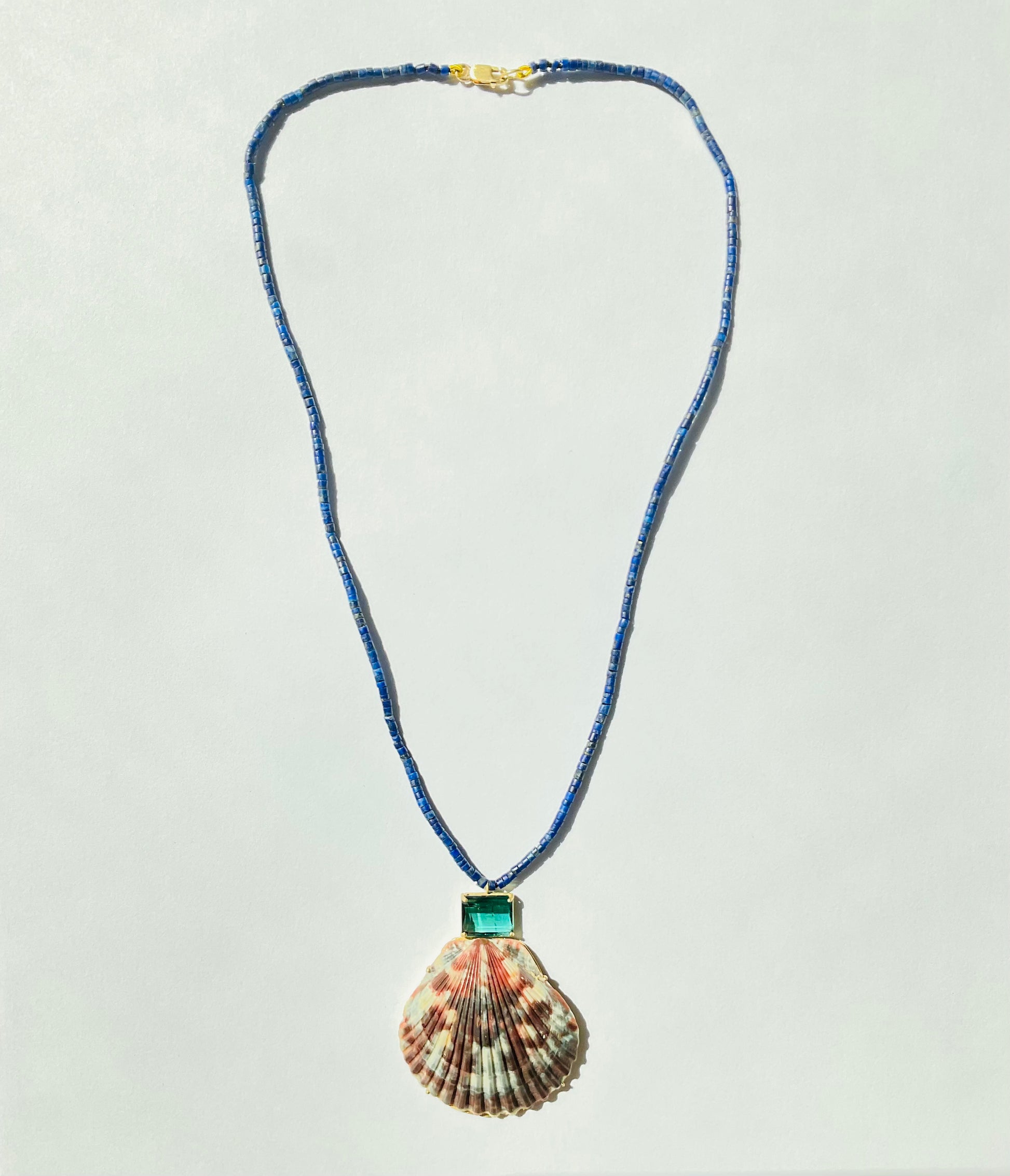 Shell with Tourmaline on Lapis Beads set in 18k gold.