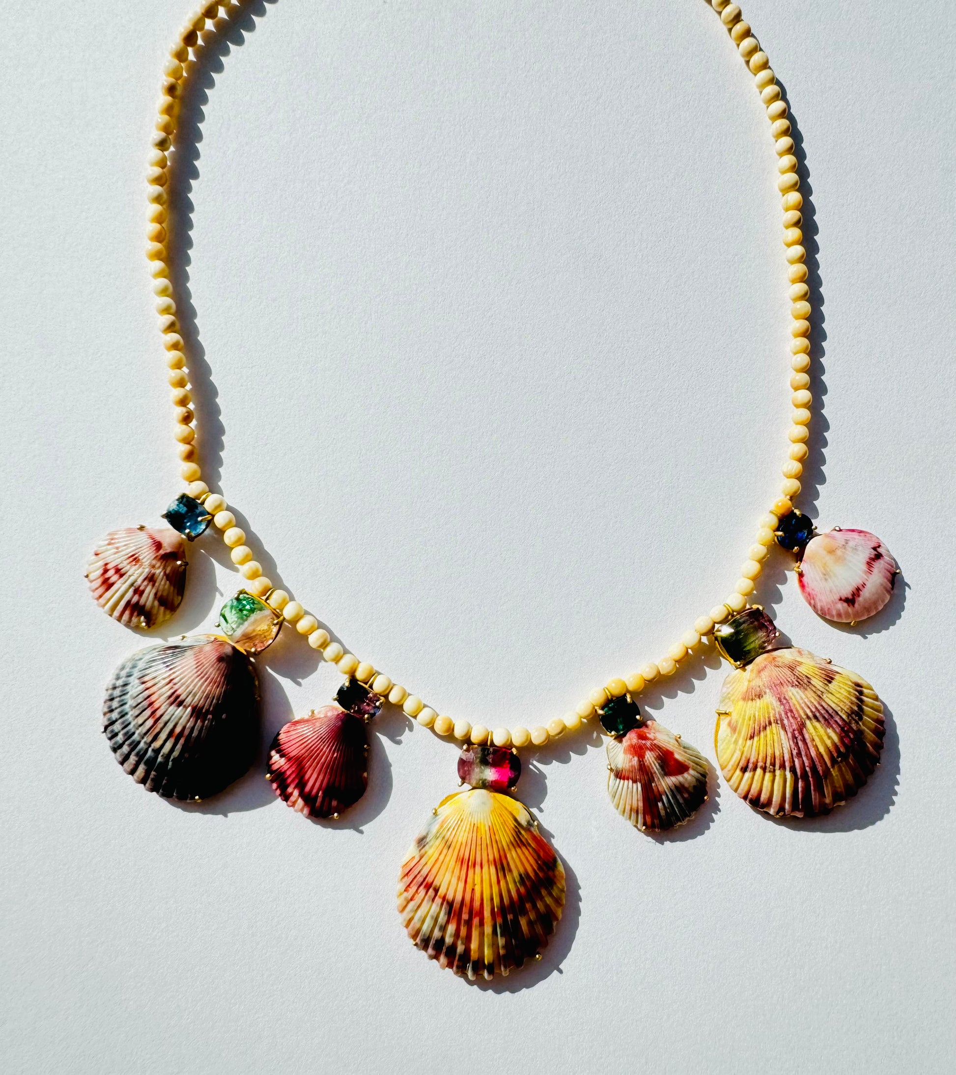 Shells and Bi Color Tourmaline set in 18 Gold on Wooly Mammoth Beads.
