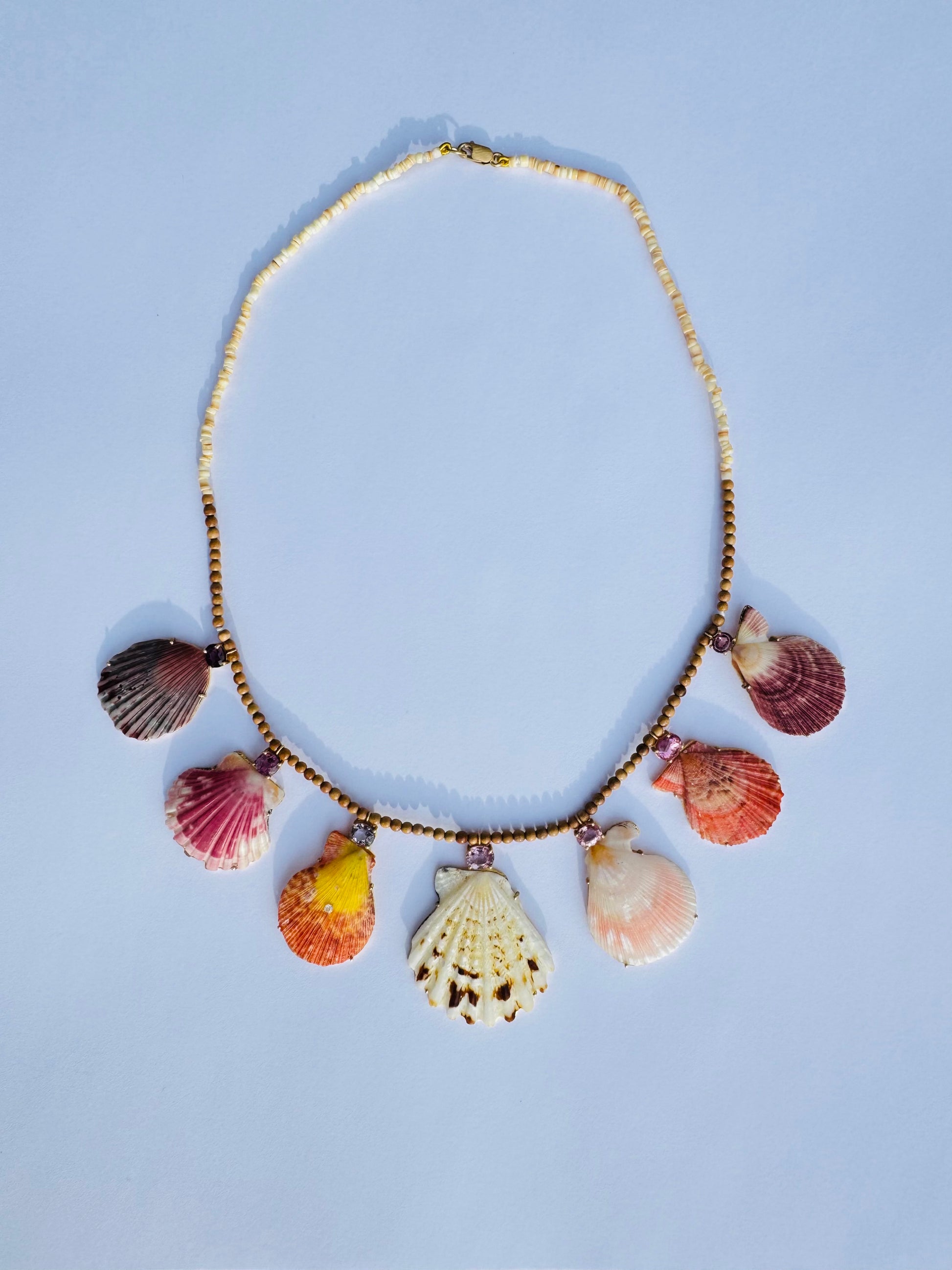 Shells and Spinel set in 18k Gold on Wood and Shell Beads.