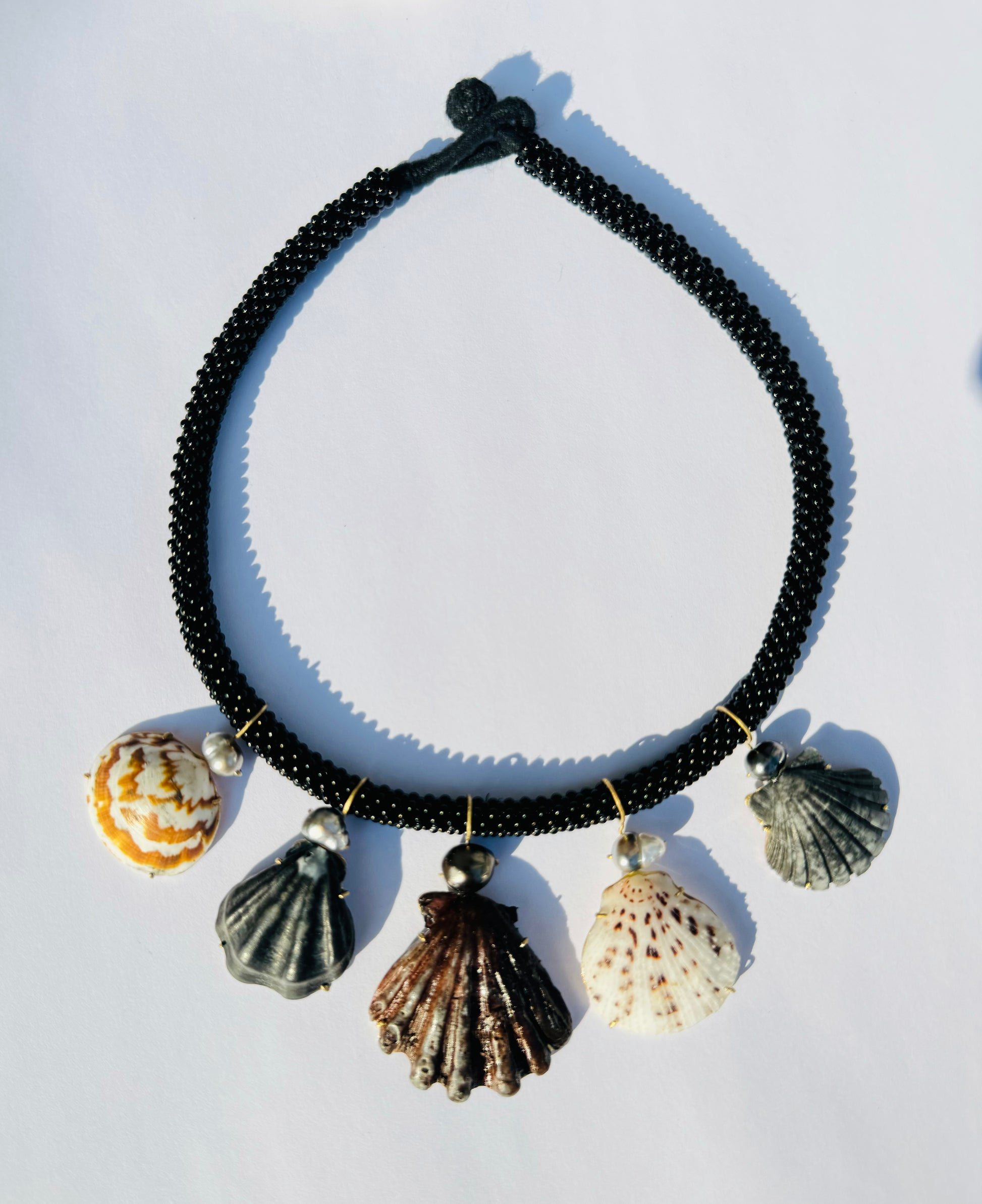 Shells on Black Onyx Cord with Tahitian Keshi Pearls