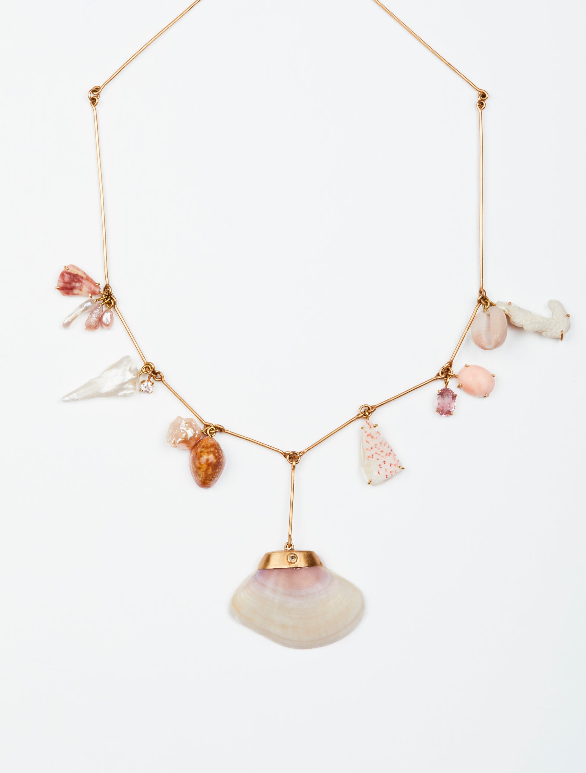 Shells, Pearls from the Tennessee River, Coral, Pink Tourmaline and Rose Cut Diamond set in 18k yellow gold. Necklace measures 16" long.