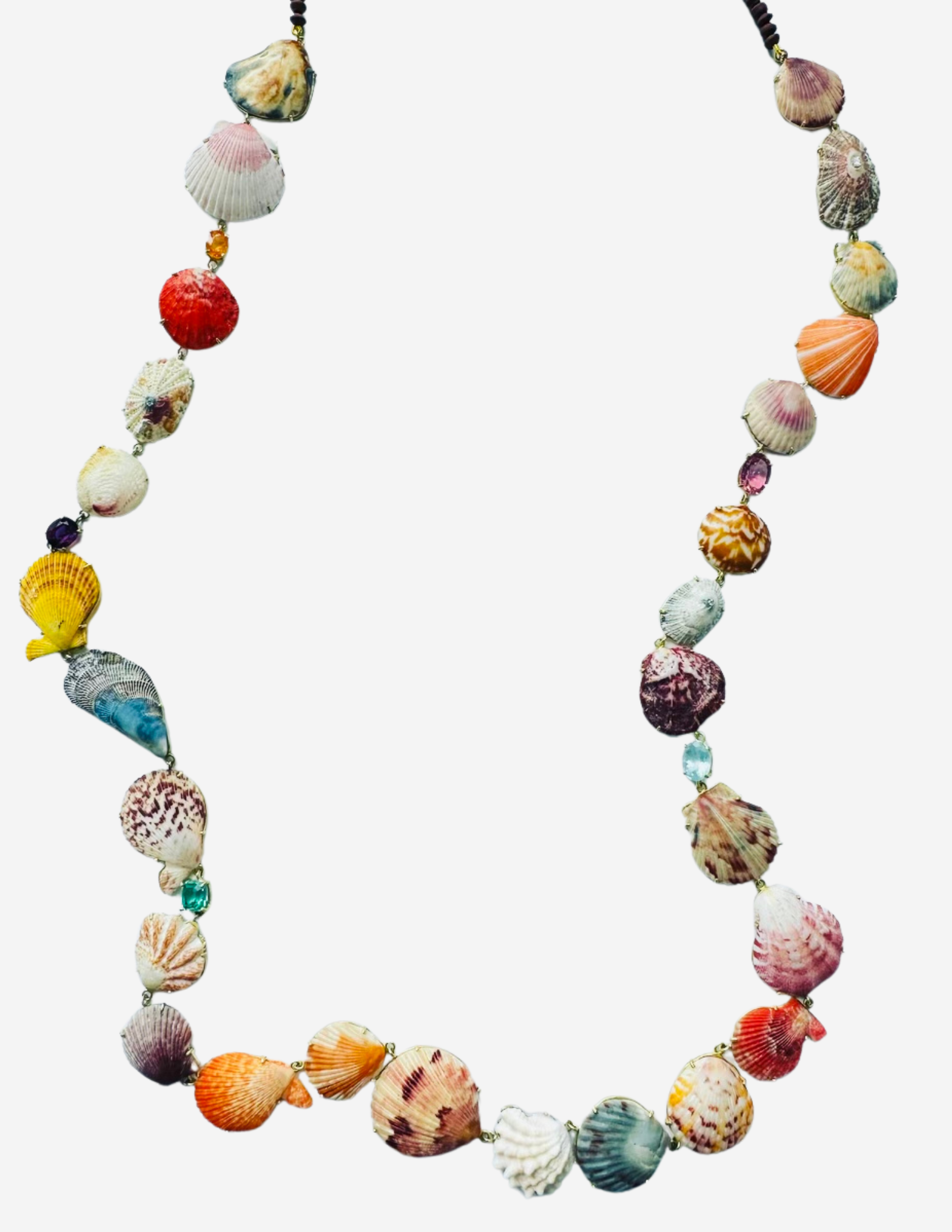 Shells with Aquamarine, Garnet, Tourmaline, Spessartite Garnet, and Diamonds on Brown Jade Beads