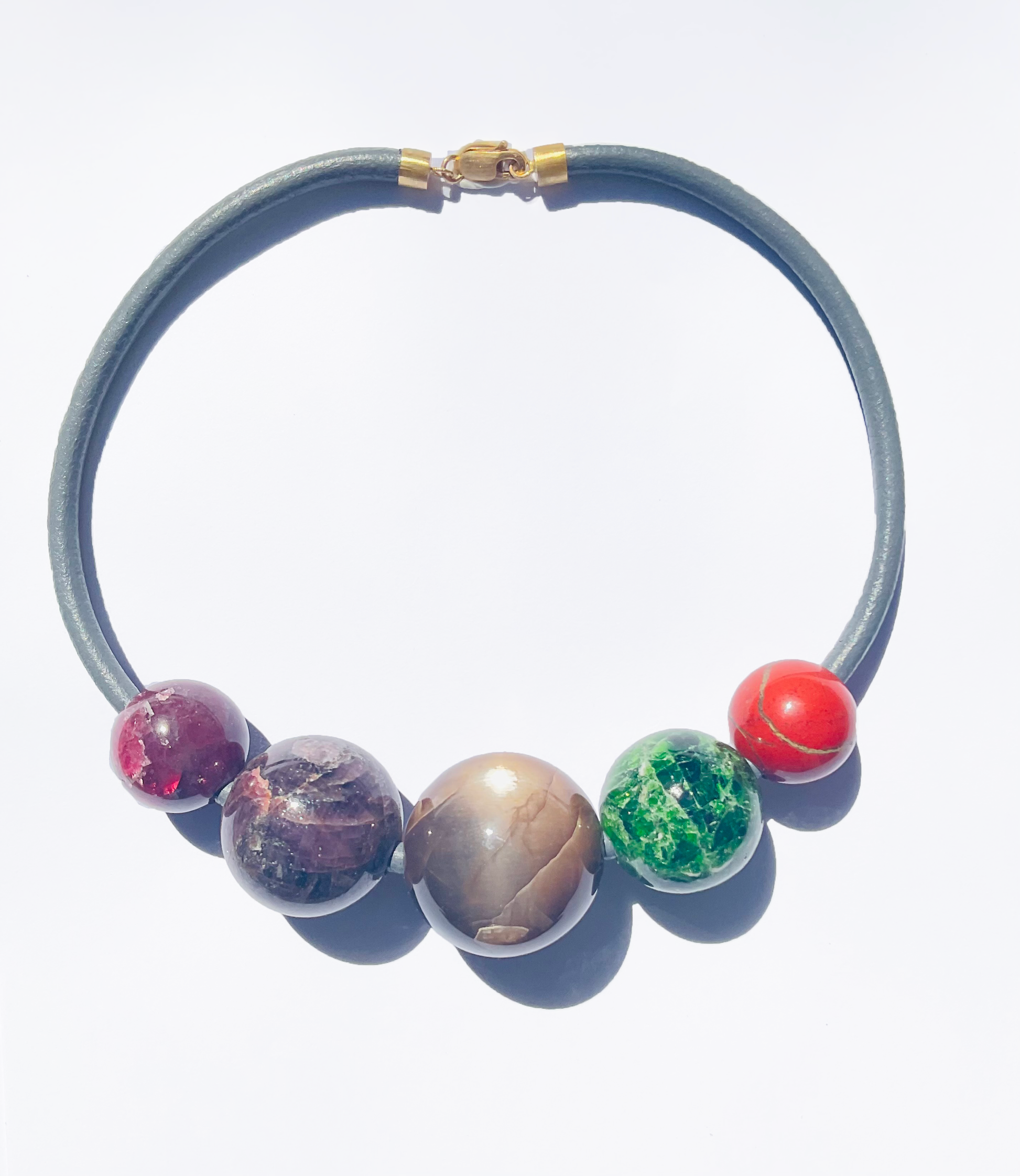 Gem Spheres Necklace in Sunstone, Garnet, Chrome Diopside and Jasper on grey leather with 18k gold clasp.