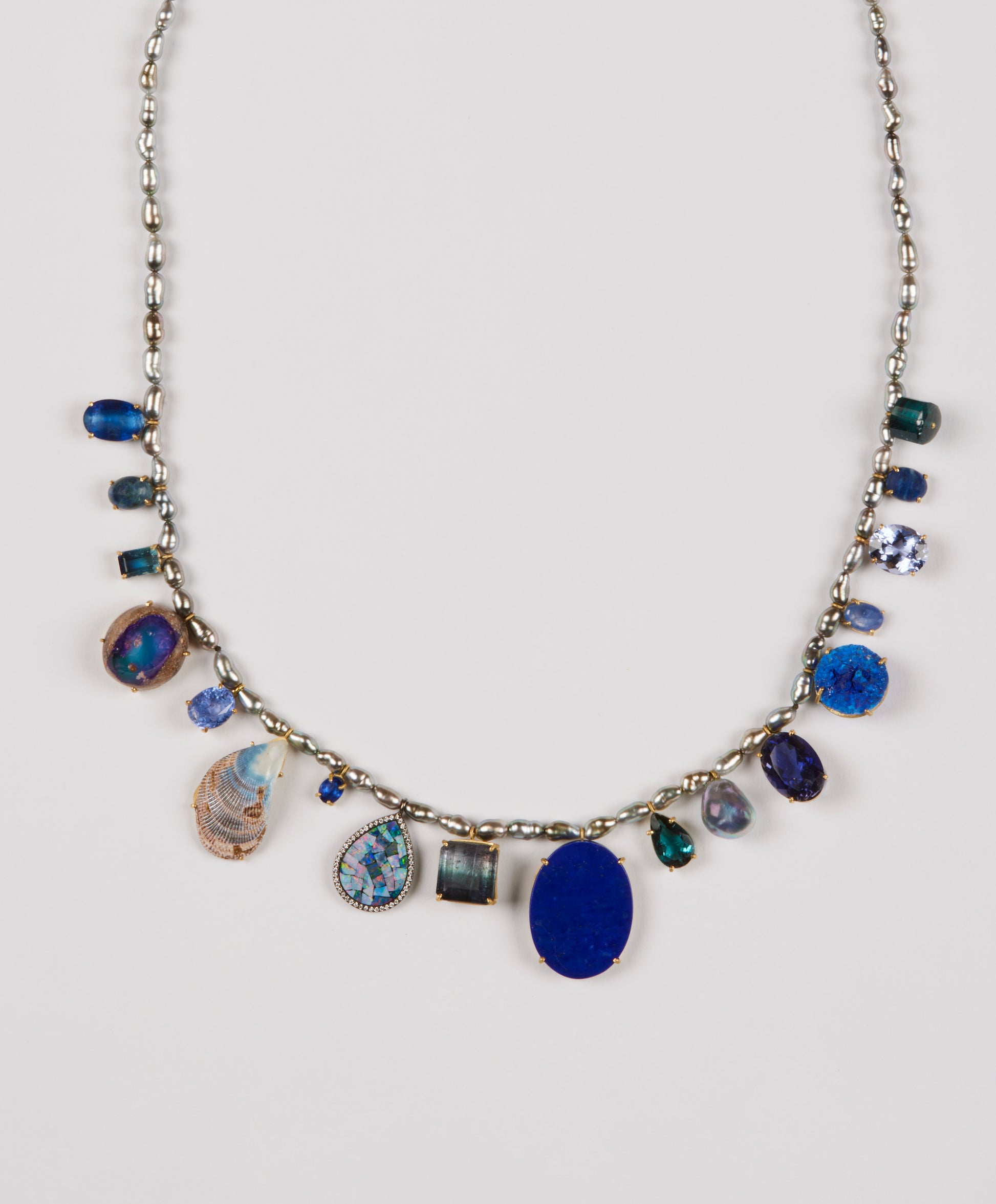 Necklace of blues with Kyanite, Lapis, Opal, Tanzanite, Sapphire and Tourmaline all set in 18k gold on Tahitian Keshi Pearls and Lapis beads measuring 32" long.