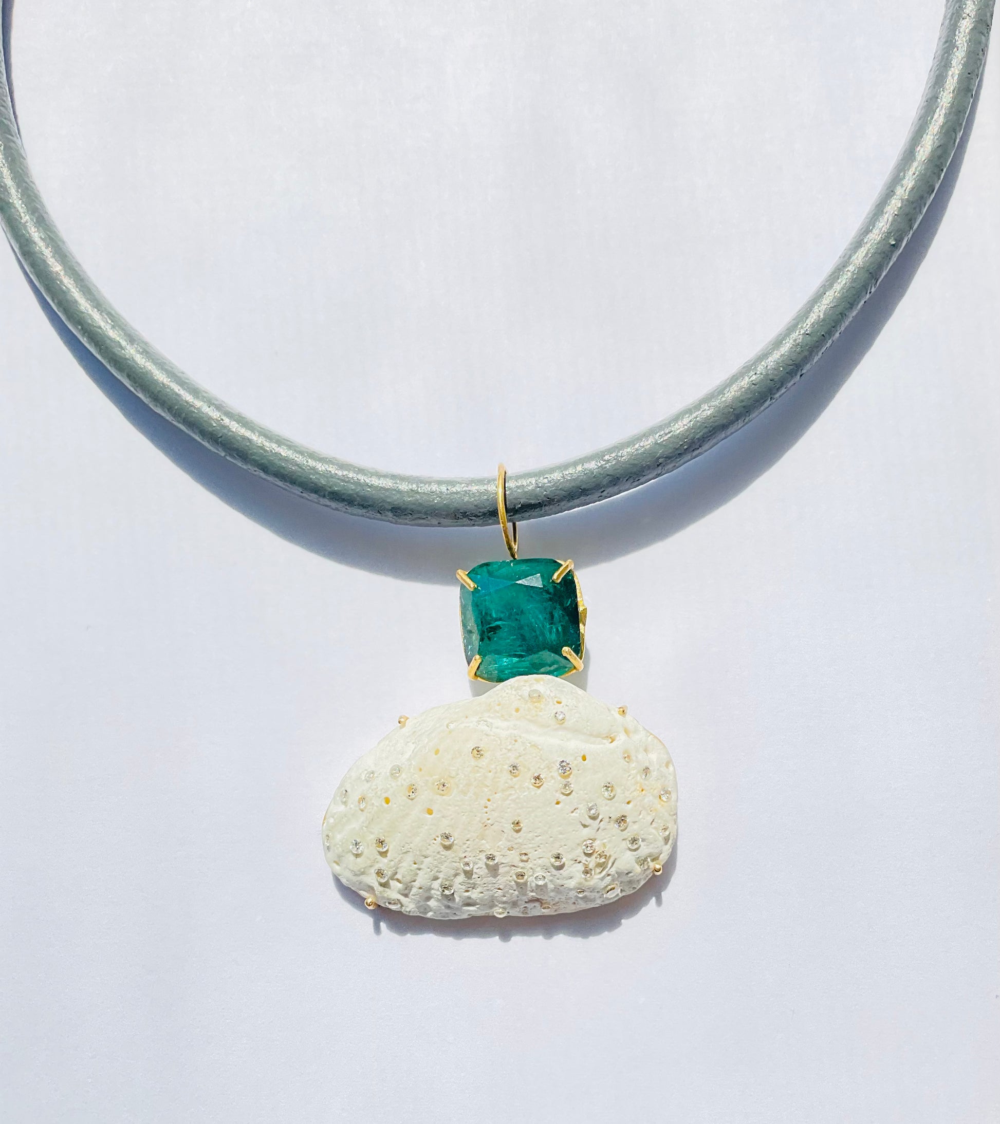 Tourmaline, Shell and Diamond Pendant set in 18k gold.