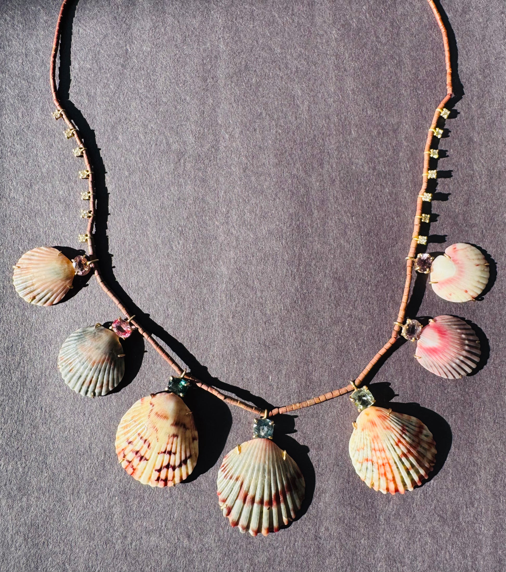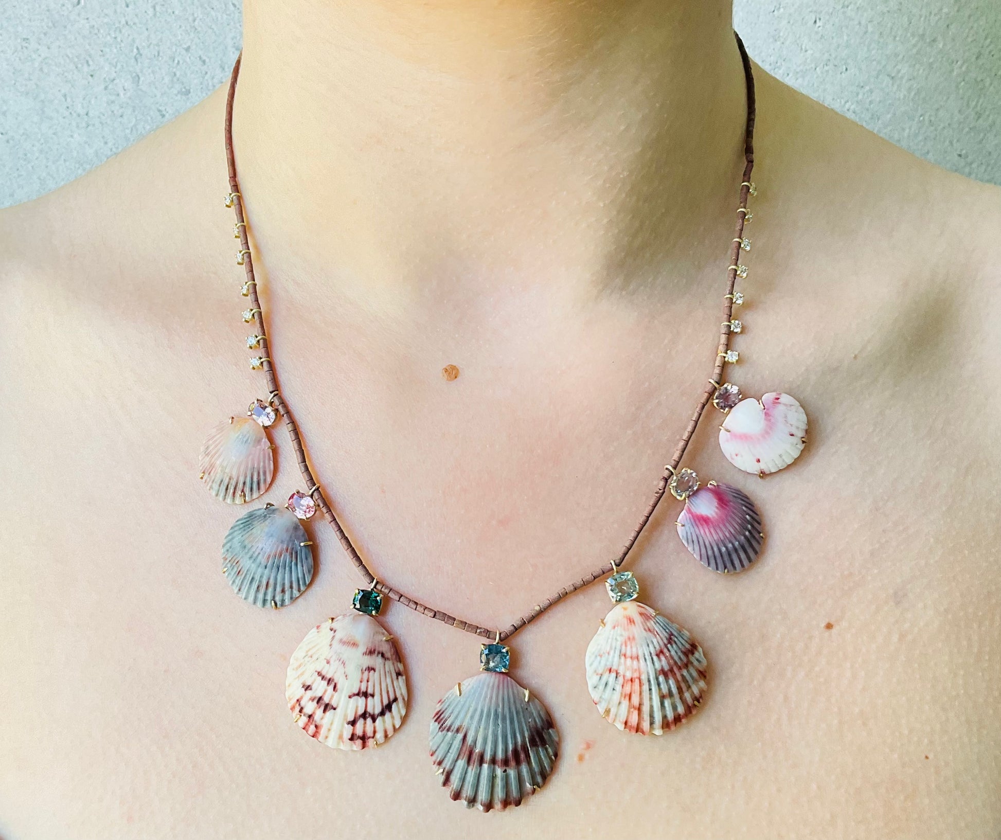 Tourmalines, Shells and Diamonds on Brown Jade Beads
