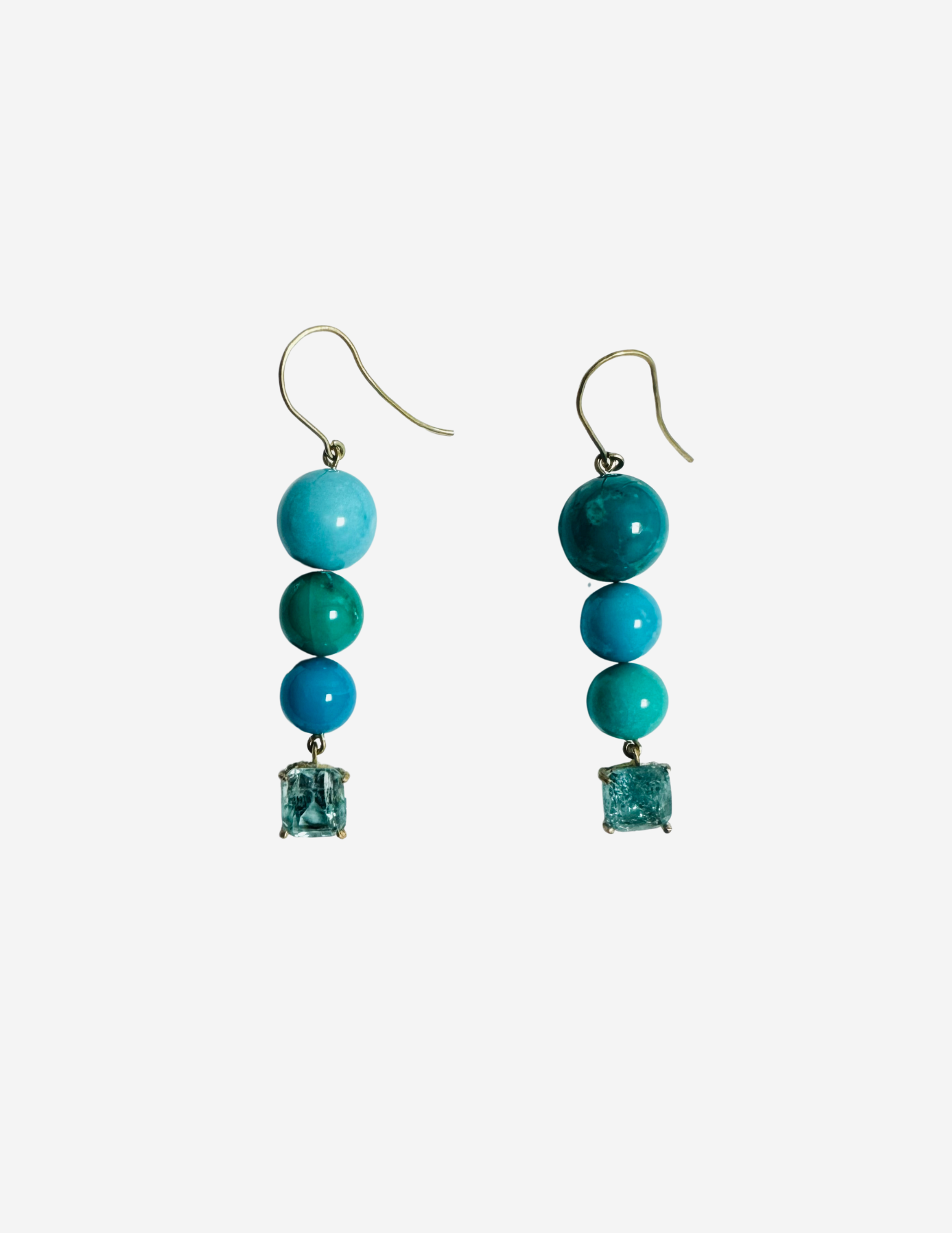 Turquoise and aquamarine earrings set in 18k yellow gold, measuring 1.5" long.