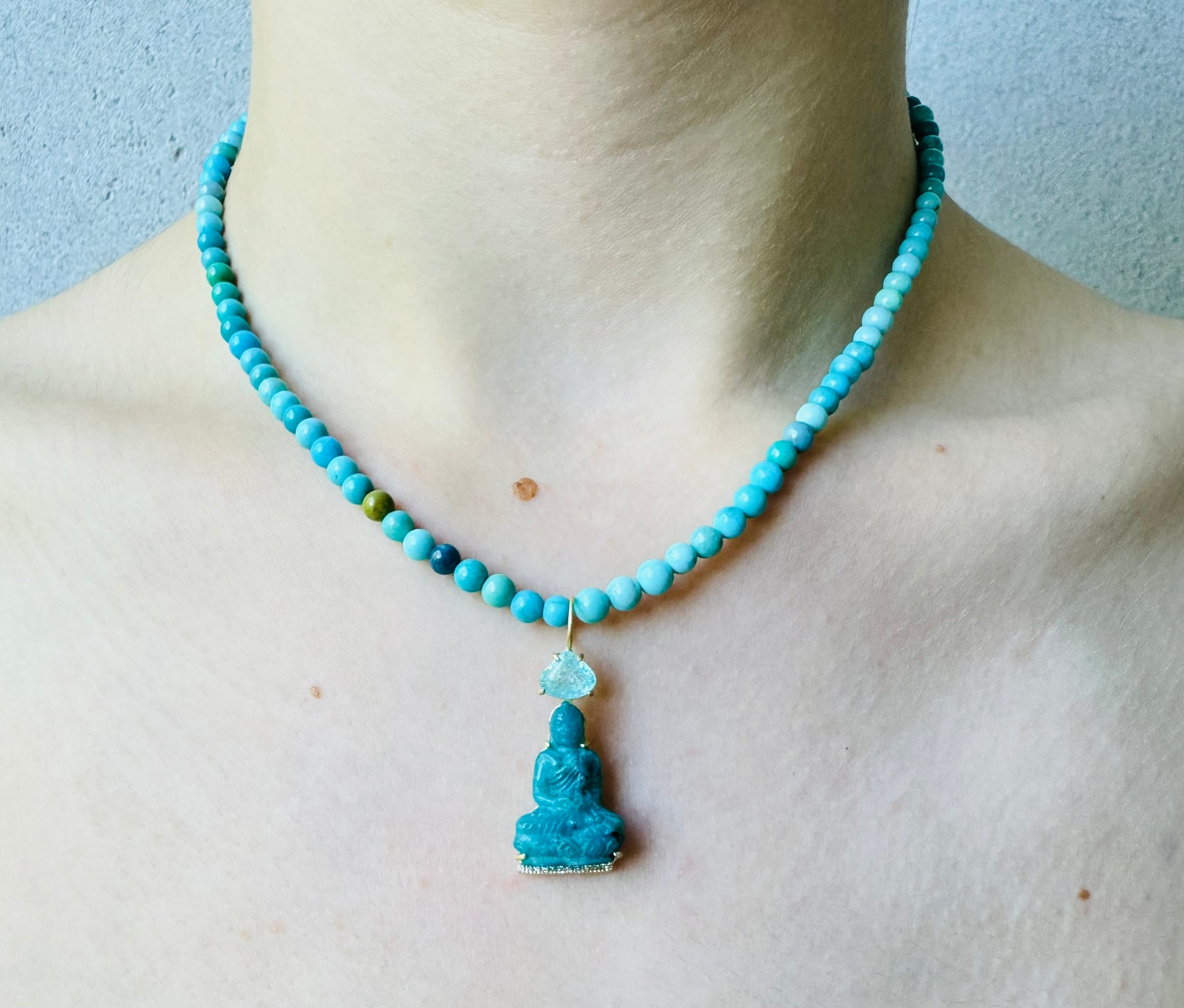 Buddha carved from Gem Silica sitting on a row of Diamonds and topped with a Paraiba, all set in 18k yellow gold. Buddha pendant hangs from Turquoise beads measuring 16" long.
