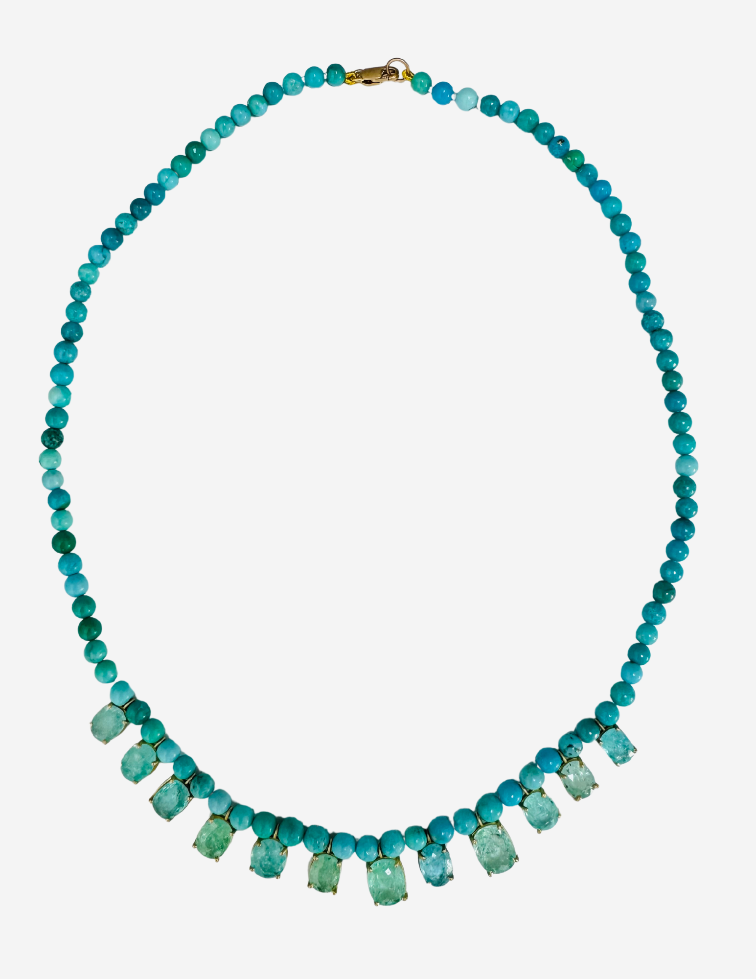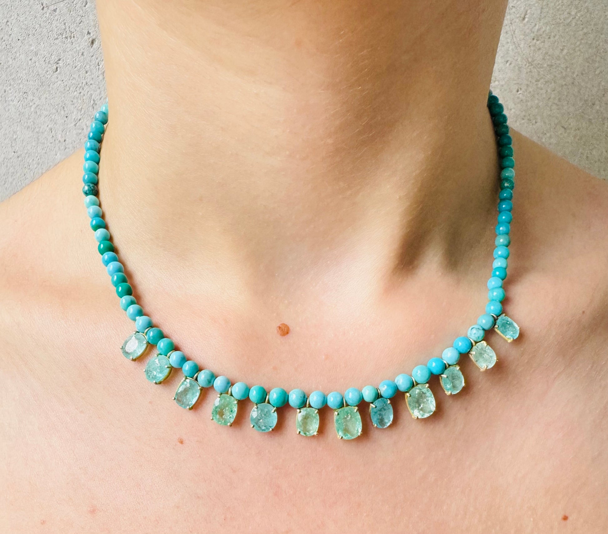 Multiple Paraiba set in 18k yellow gold hanging on round Turquoise beads measuring 16" long. Clasp is made of 18k yellow gold.