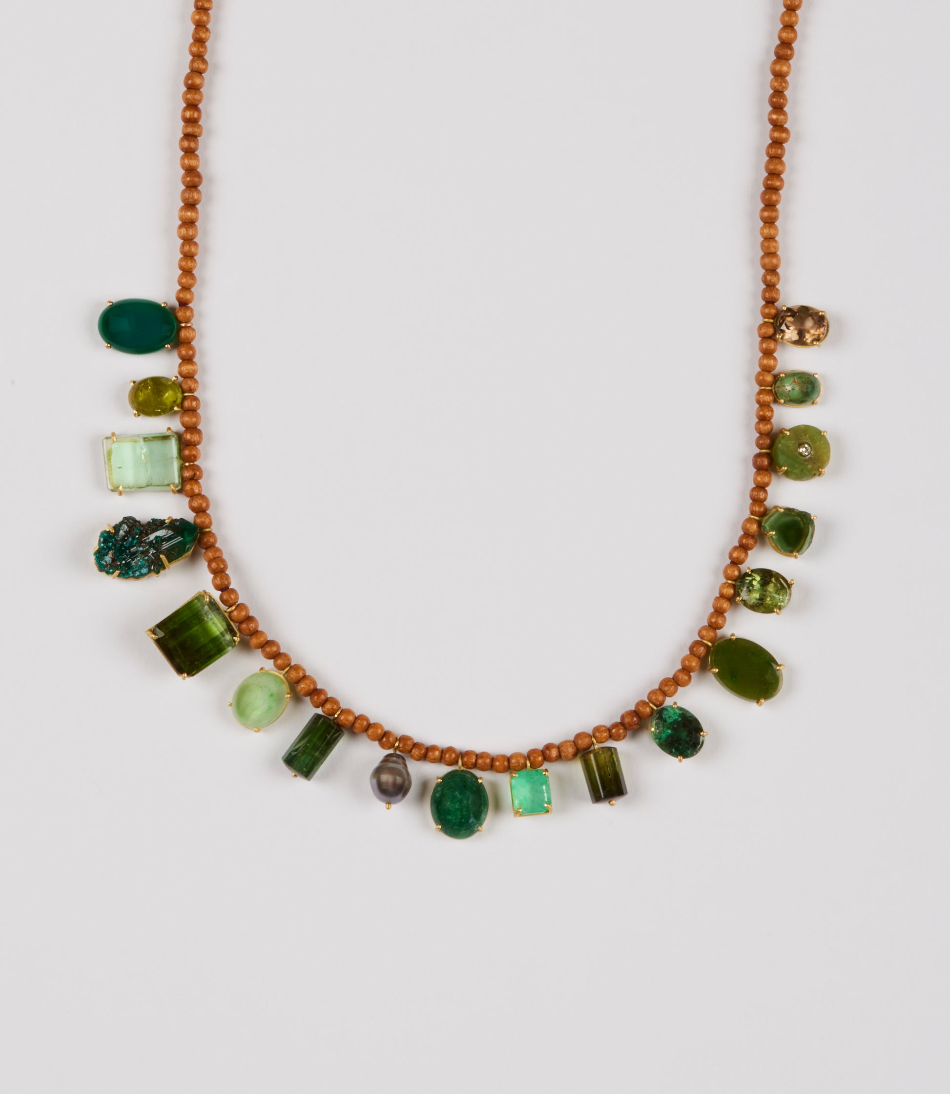 Wood Beads with Green Onyx, Tourmaline Dioptase, Jade, Emerald, Variscite and Smokey Topaz