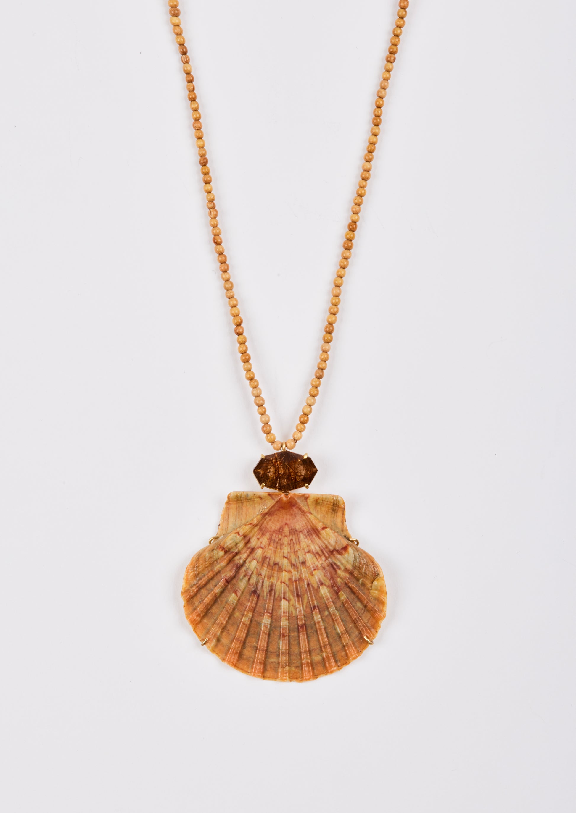 Wood Beads with Rudilated Quartz and Rare Shell Pendant
